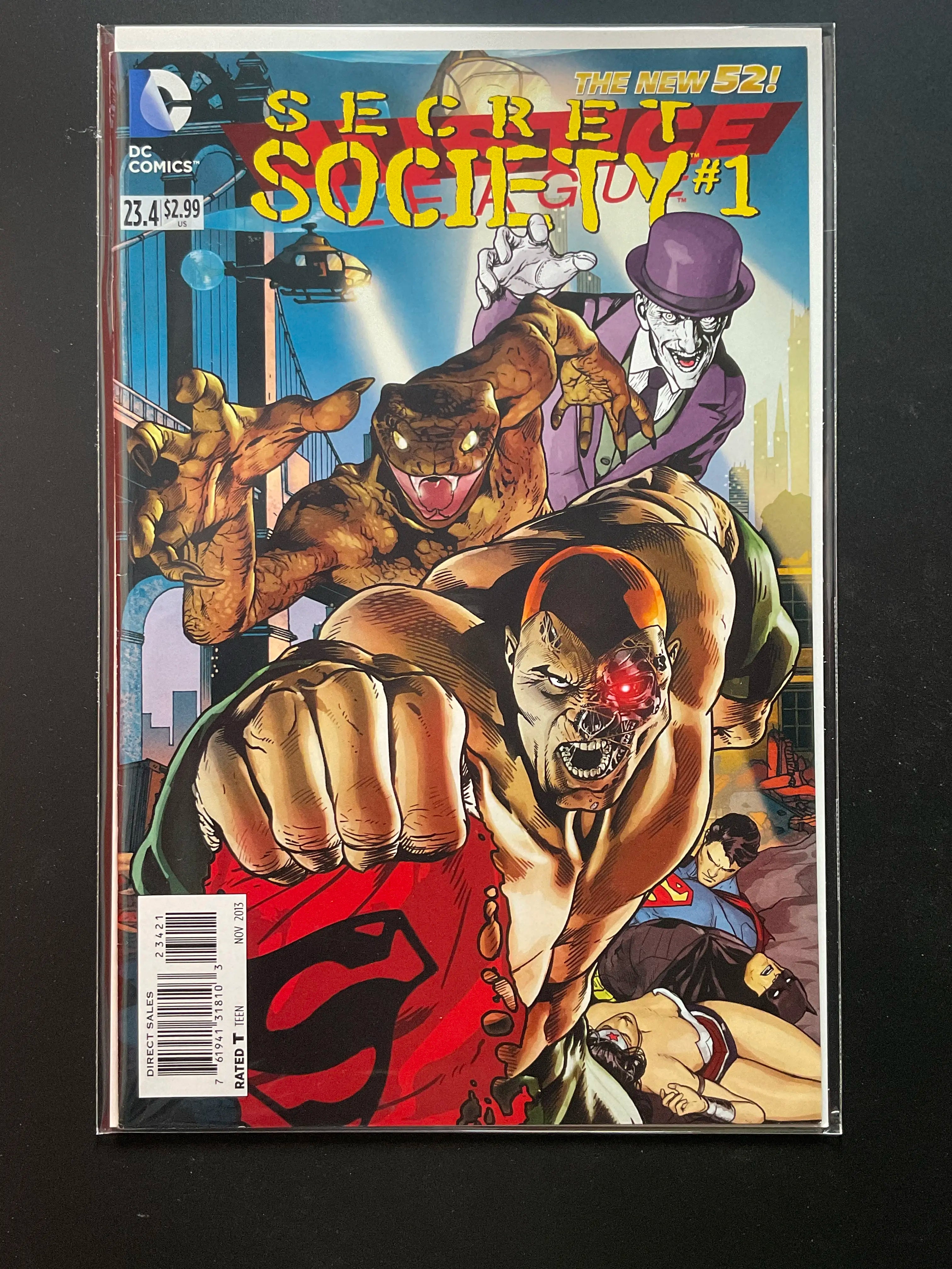 Secret Society #1, published by DC Comics in November 2013 as part of The New 52 series. Features characters such as The Joker, Superman, and Wonder Woman. Cover art showcases a battle scene with prominent villains.