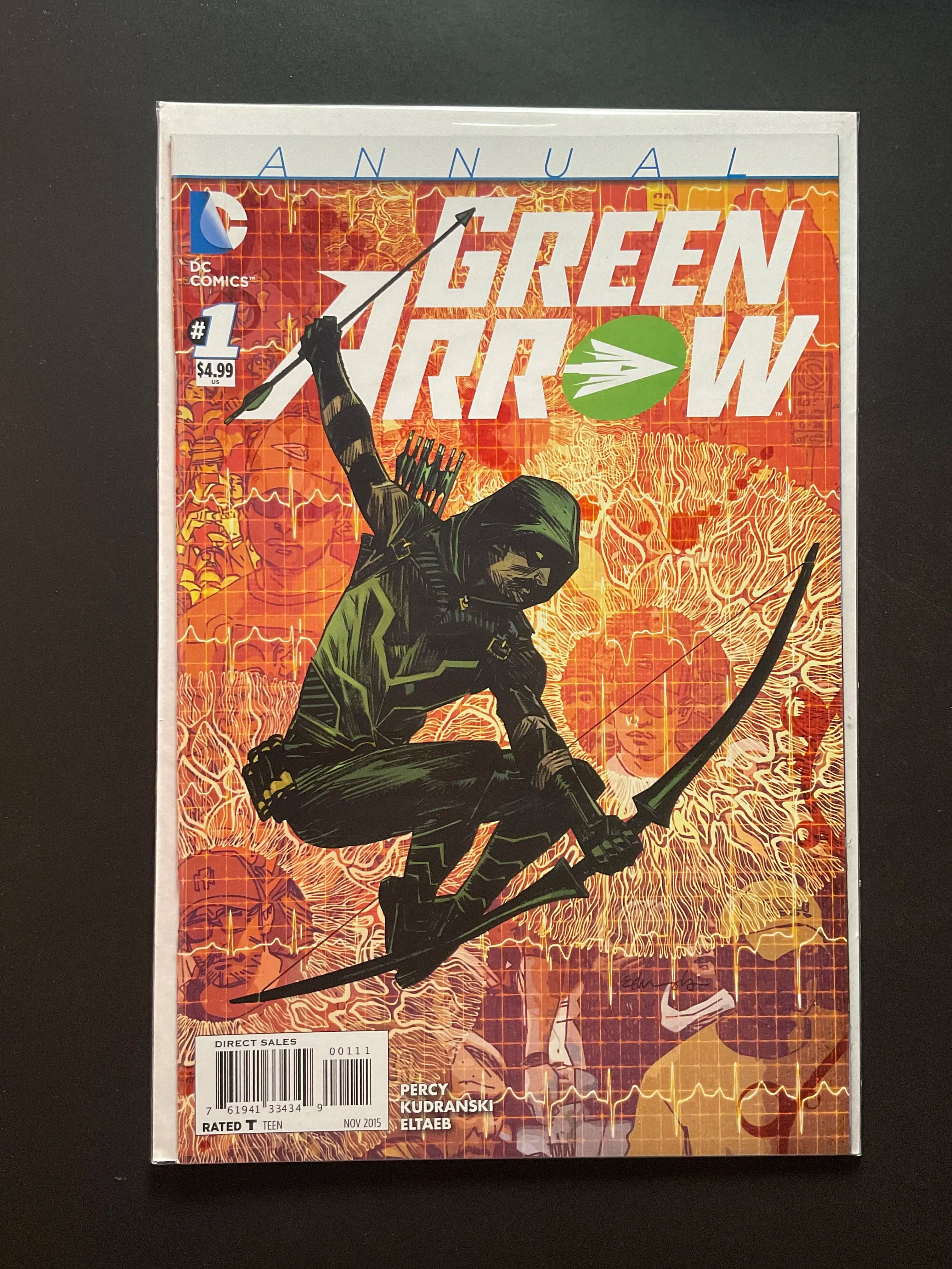 Green Arrow Annual #1, published by DC Comics in November 2015. Written by Benjamin Percy with artwork by Szymon Kudranski and colors by Gabe Eltaeb. Features Green Arrow as the main character.