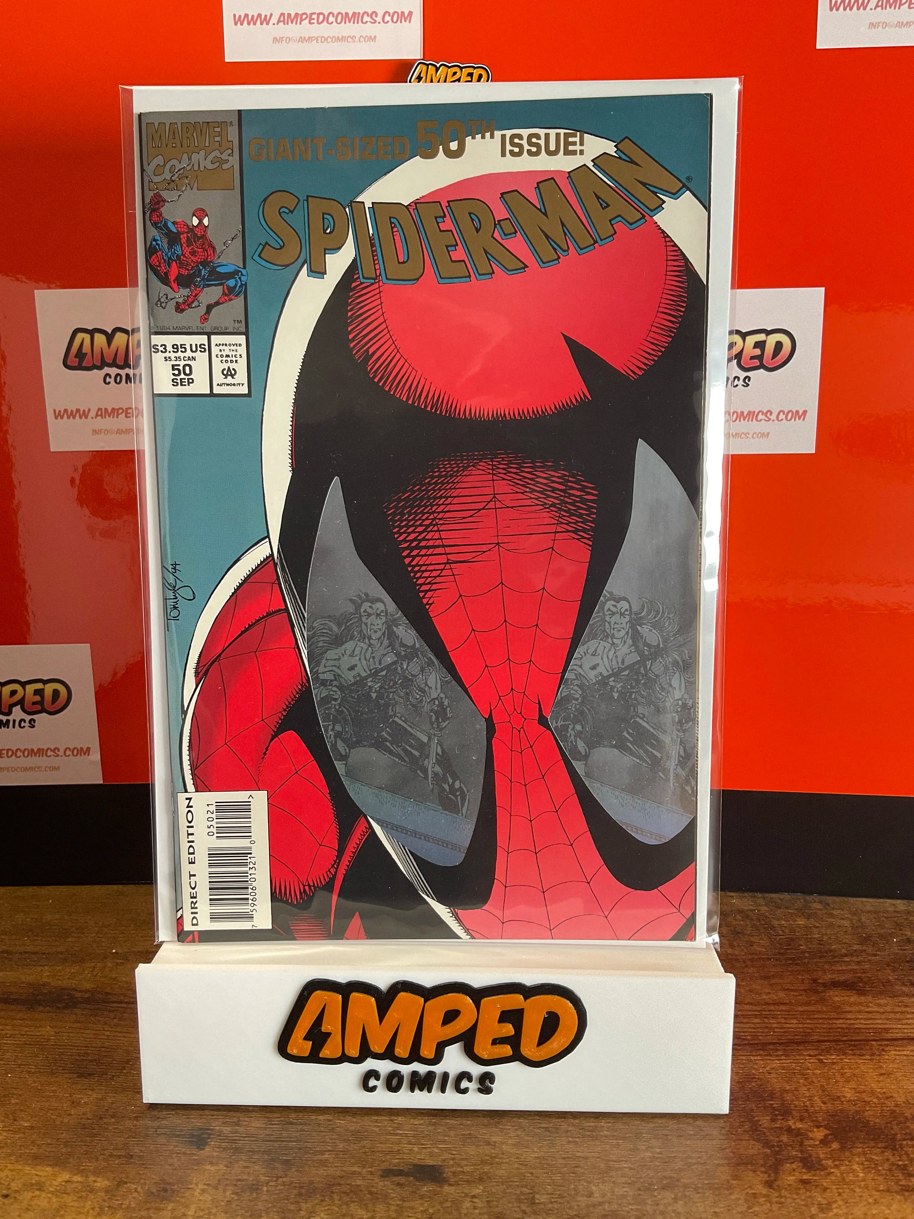 Spider-Man #50, Giant-Sized 50th Issue, published by Marvel Comics in September 1994. Features cover art by Mark Bagley and a storyline involving Spider-Man. This issue is part of the Modern Age of comics.