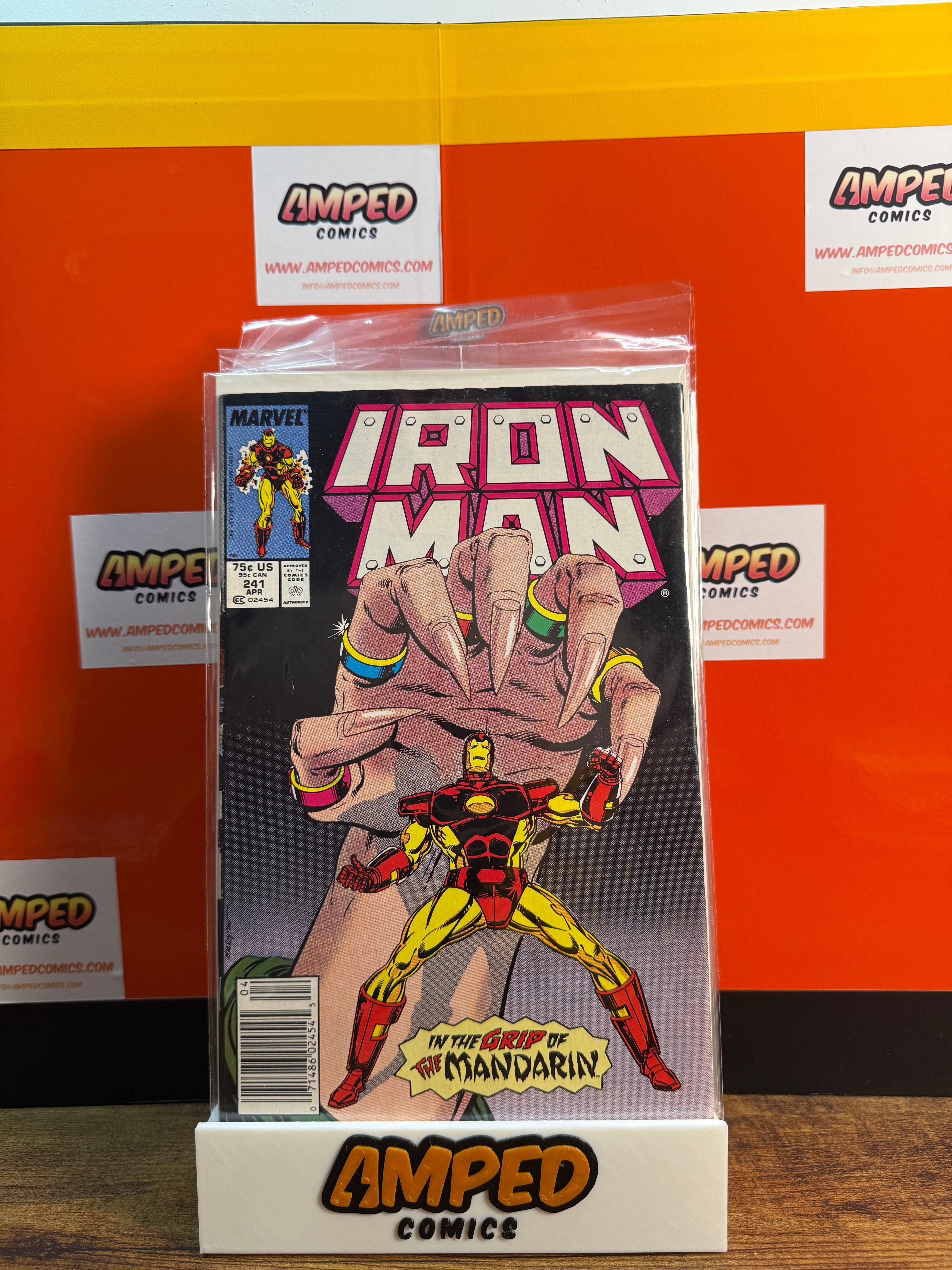Iron Man #241, published by Marvel Comics in April 1989. This issue features Iron Man in 'In the Grip of the Mandarin,' with the Mandarin as a key character. Cover art showcases Iron Man and the Mandarin's hand prominently.