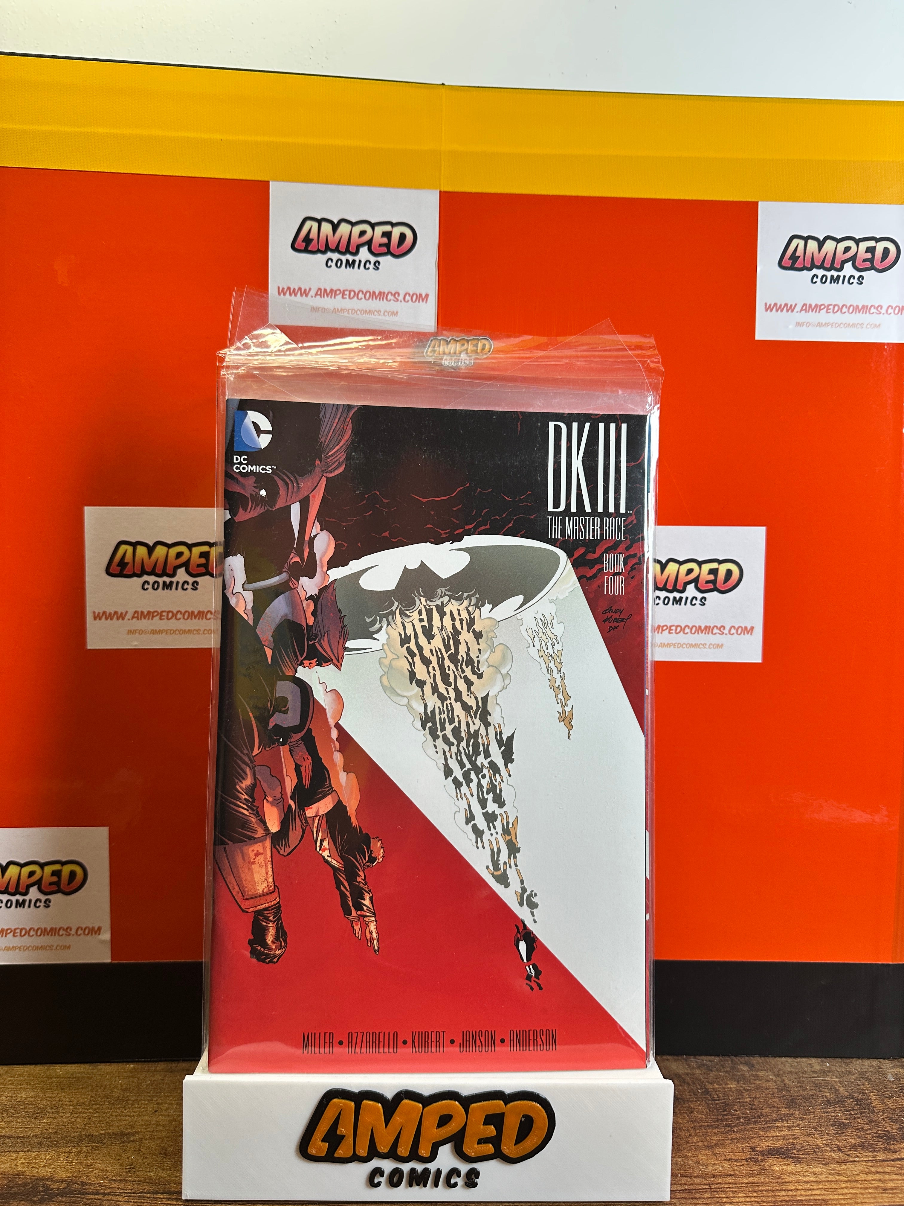 DK III: The Master Race Book Four, published by DC Comics. Written by Frank Miller and Brian Azzarello, with artwork by Andy Kubert and Klaus Janson. This issue is part of the Dark Knight III series, a continuation of the iconic Dark Knight Returns storyline.
