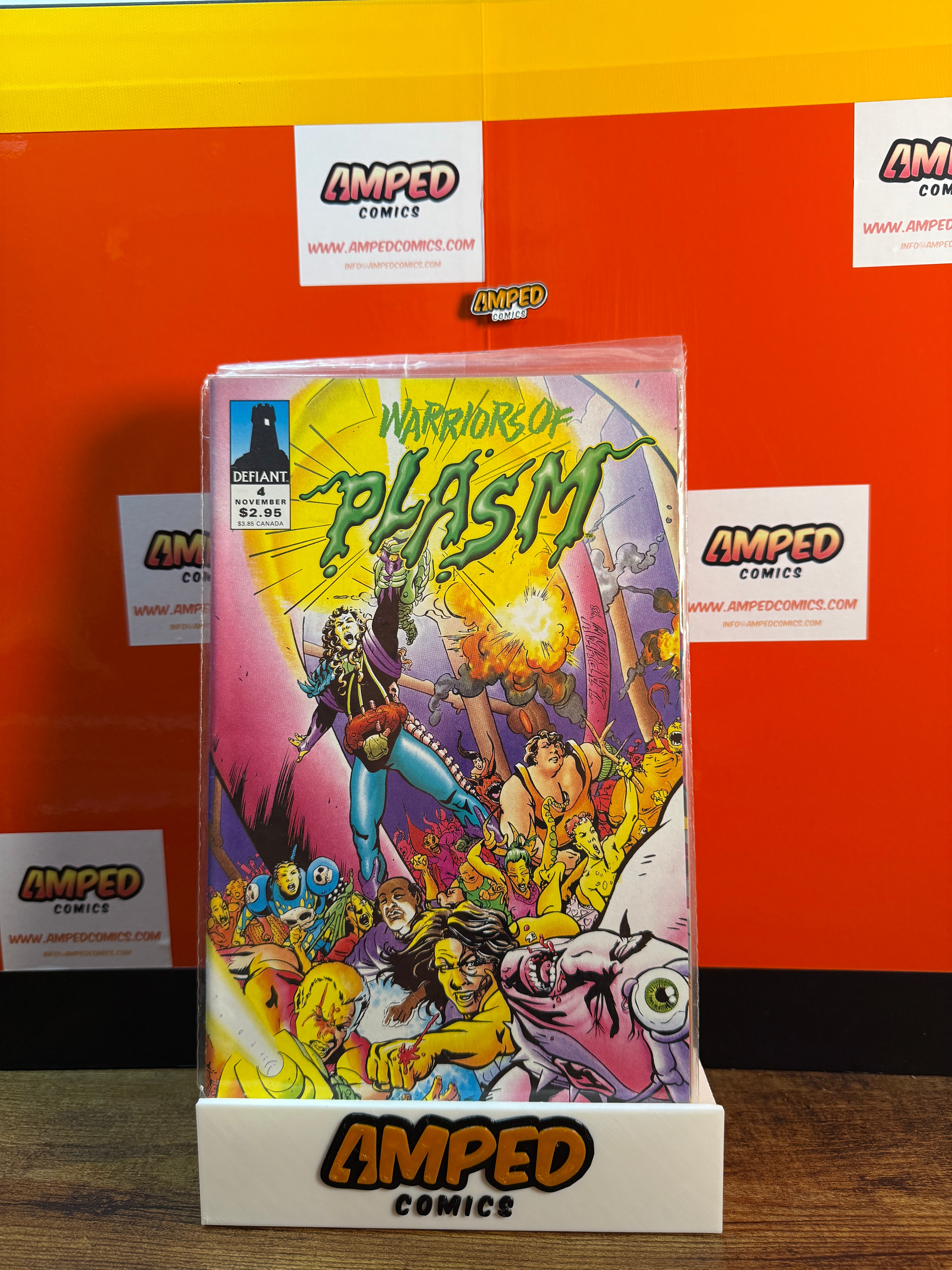 Warriors of Plasm #4, published by Defiant Comics in November 1993. Created by Jim Shooter, this issue features a vibrant cover and continues the sci-fi saga of the Plasm universe.