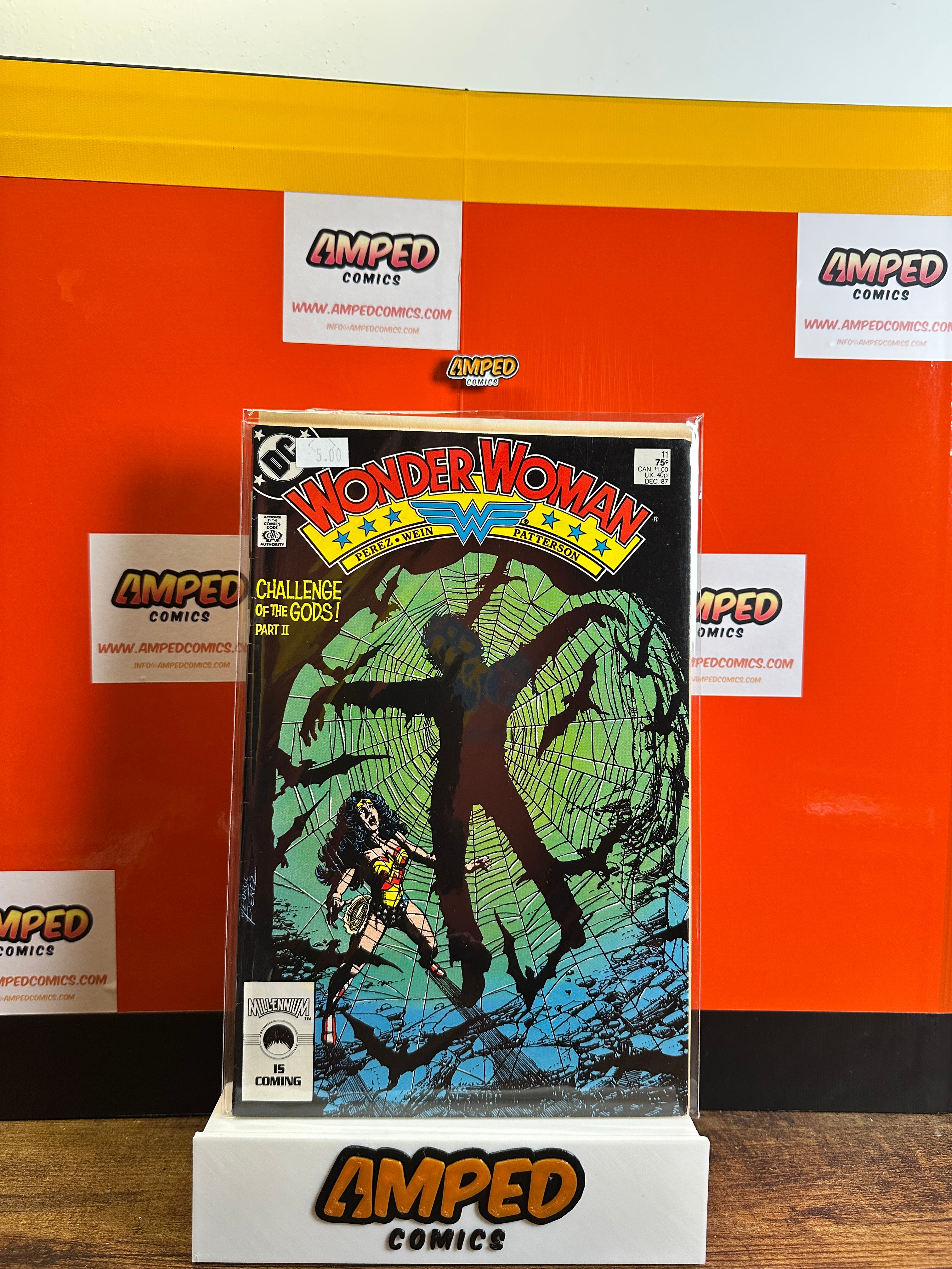 Wonder Woman #11, published by DC Comics in 1988. Written by Len Wein with artwork by George Pérez and Bruce Patterson. This issue is part of the 'Challenge of the Gods' storyline, featuring Wonder Woman in a pivotal battle.