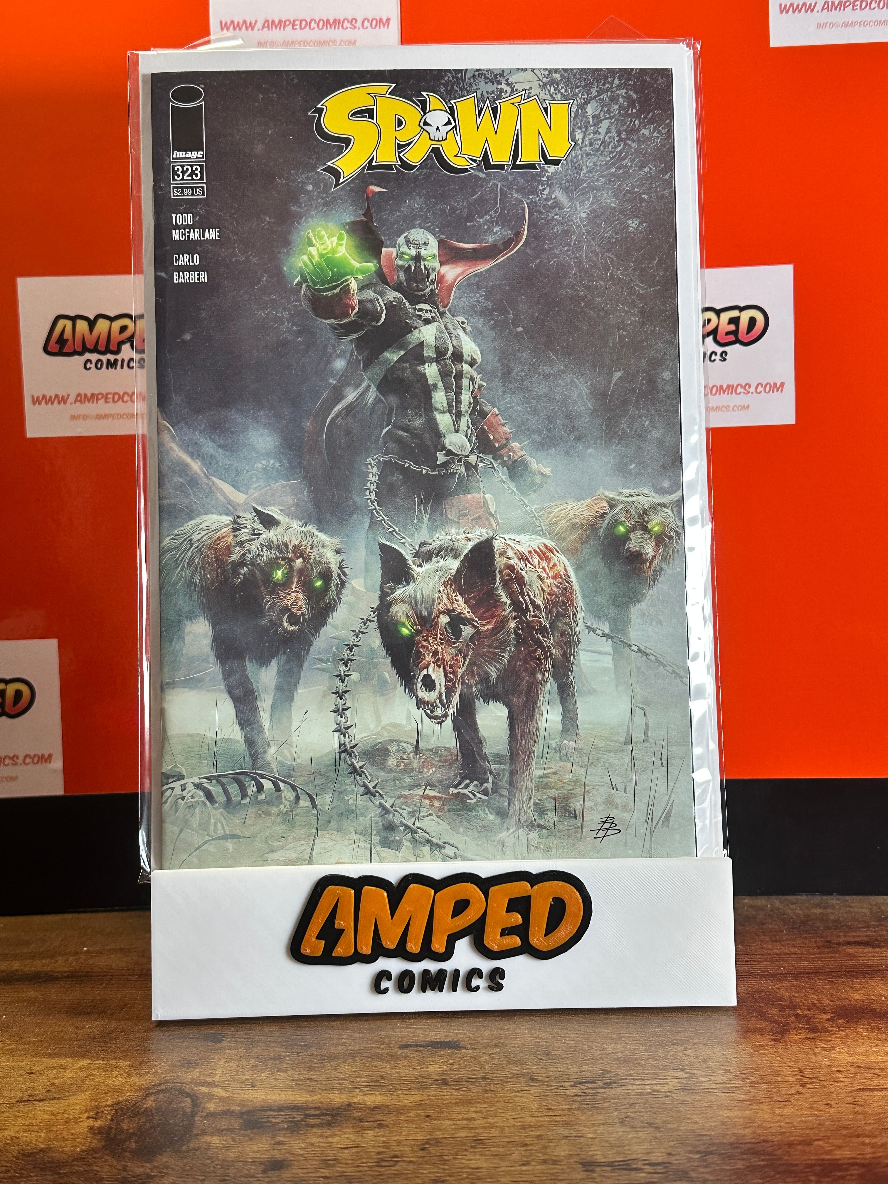 Spawn #323 published by Image Comics. Written by Todd McFarlane with artwork by Carlo Barberi. Features Spawn on the cover with a dark, atmospheric design. Released in 2021.