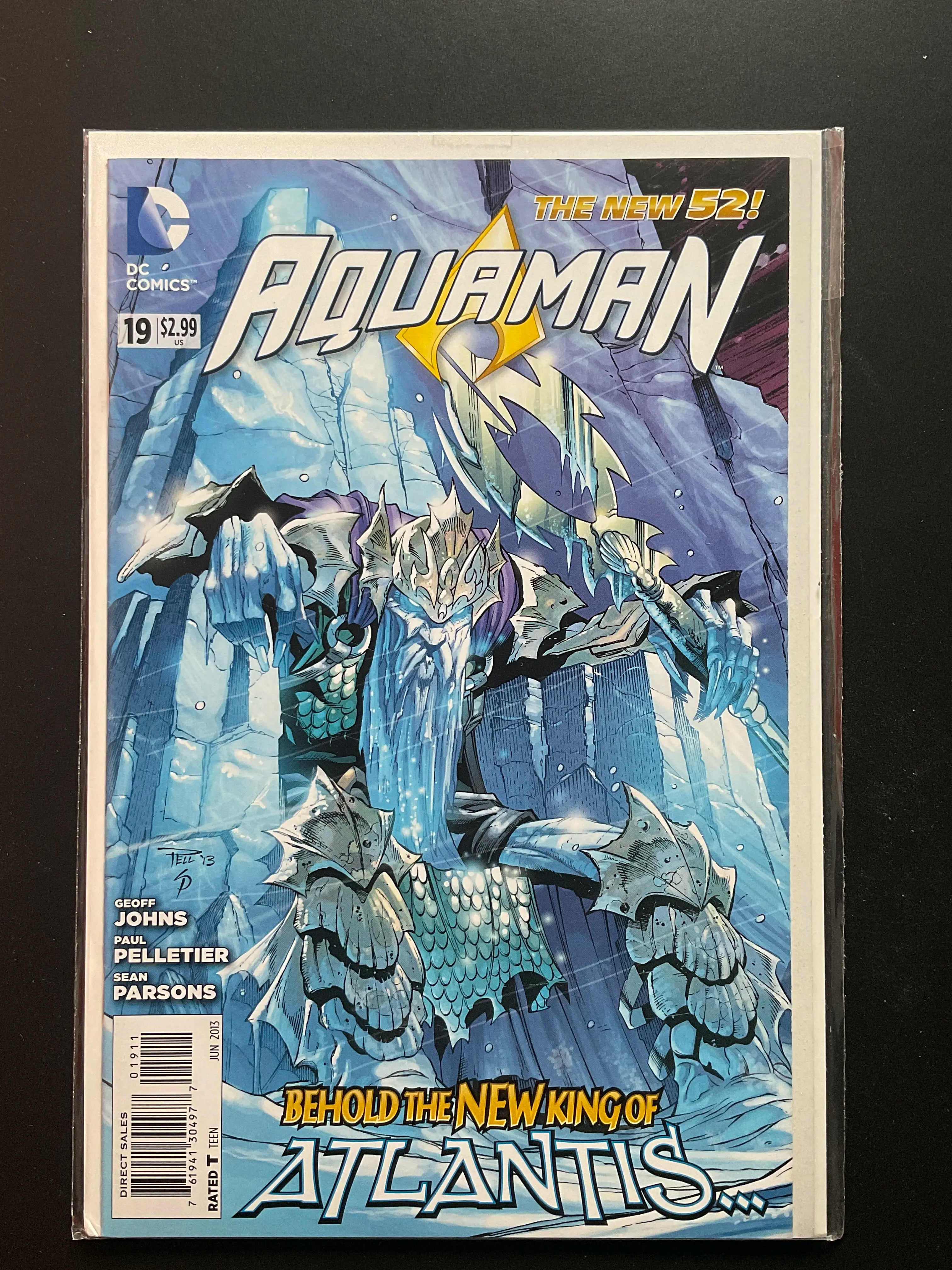 Aquaman #19 from DC Comics, part of The New 52 series. Published in June 2013. Written by Geoff Johns with artwork by Paul Pelletier and Sean Parsons. Features the storyline 'Behold the New King of Atlantis.'