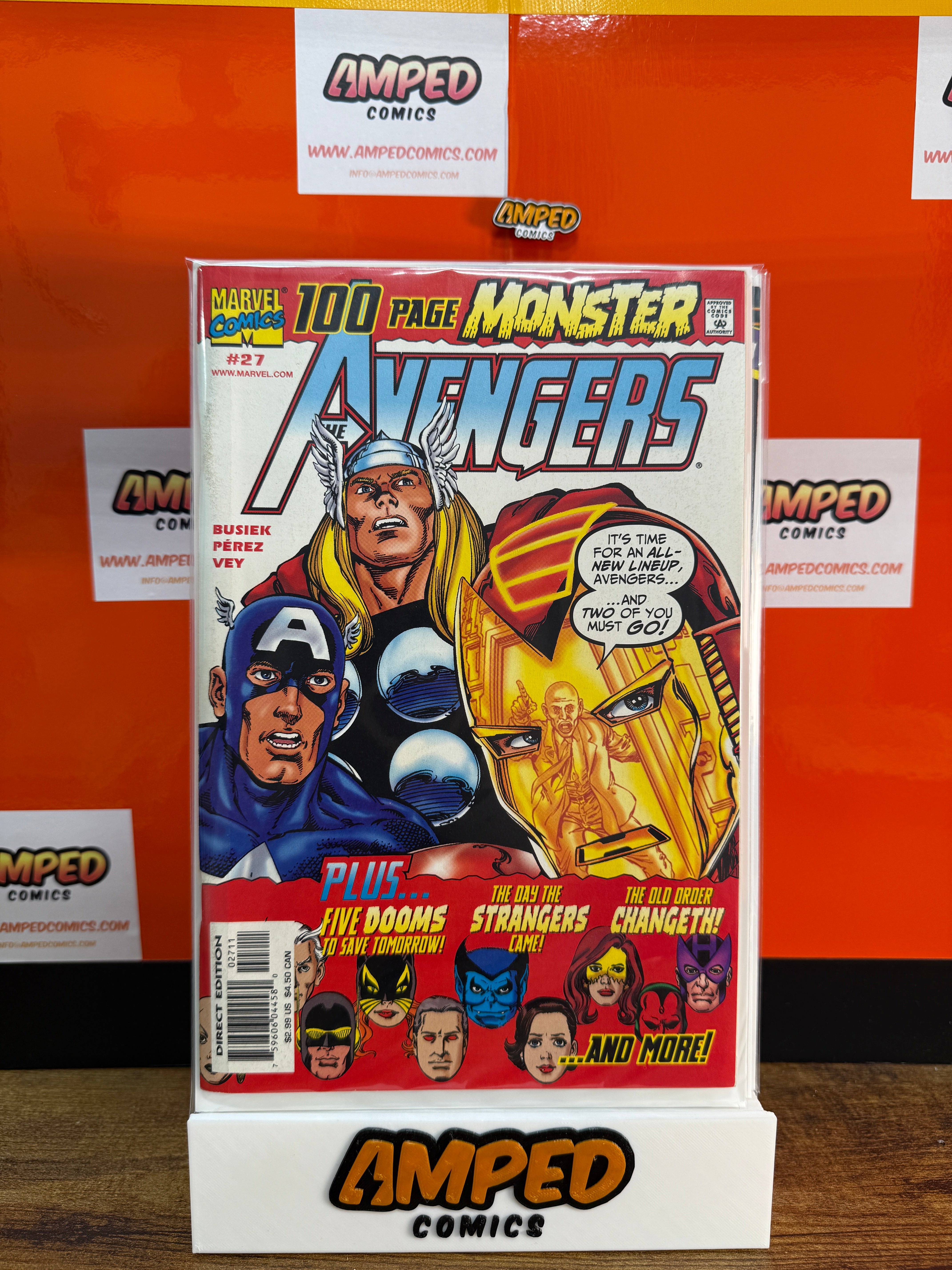 Avengers #27, published by Marvel Comics. This 100-page special issue features stories by Kurt Busiek and George Pérez, with appearances by Thor, Captain America, and other Avengers. Includes multiple storylines such as 'Five Dooms to Save Tomorrow' and 'The Day the Strangers Came!'