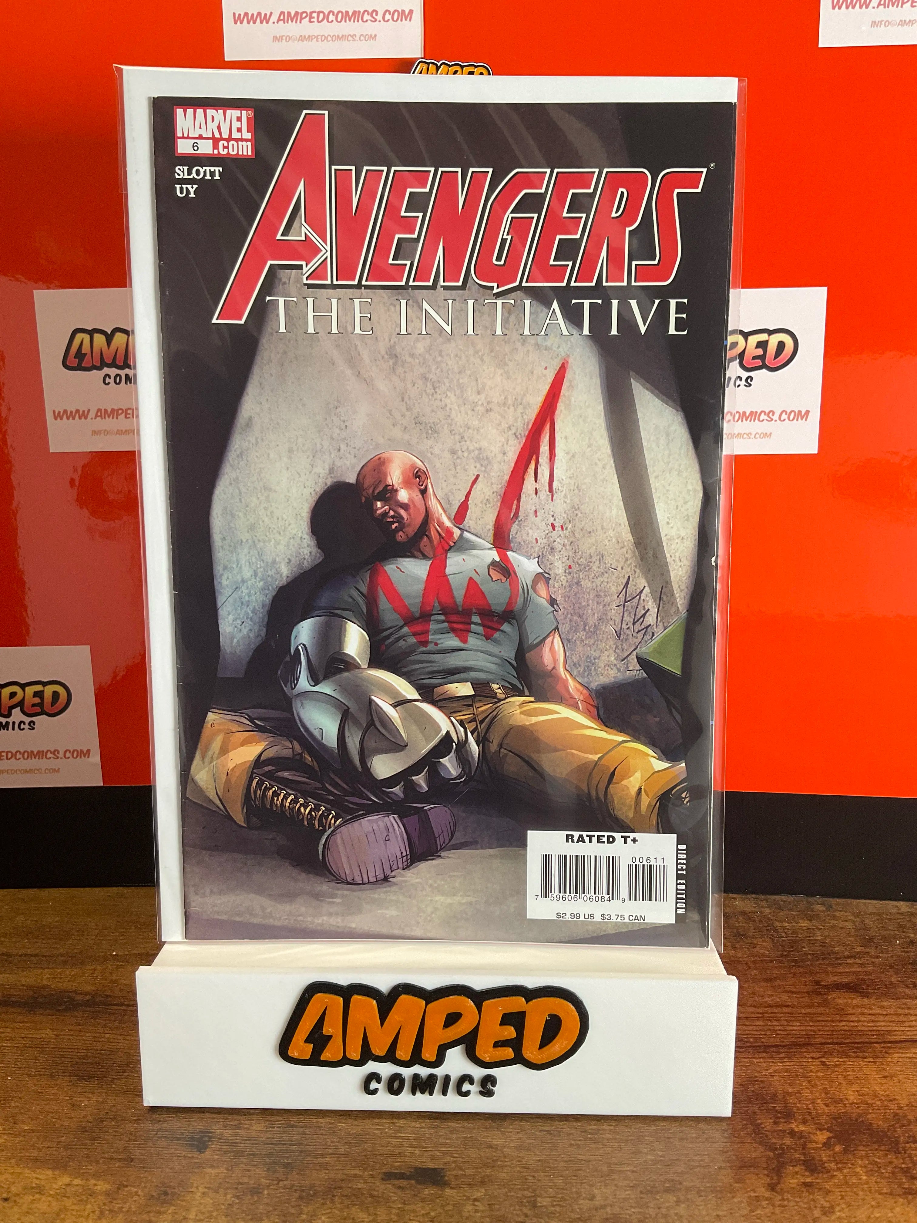 Avengers: The Initiative #6, published by Marvel Comics in 2007. Written by Dan Slott with artwork by Steve Uy. Features a dramatic cover and storyline involving key characters from the Avengers Initiative series.
