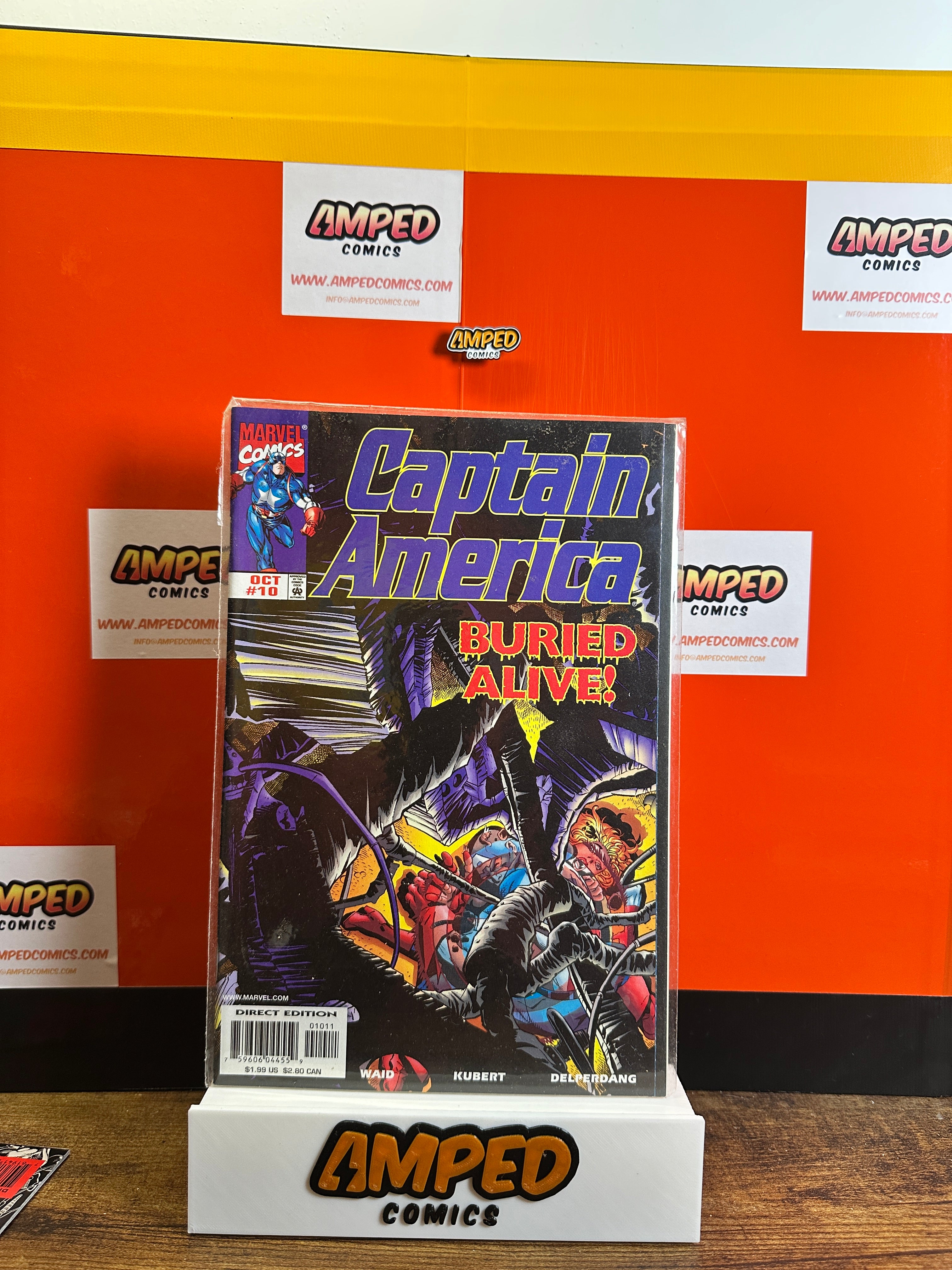 Captain America #10, published by Marvel Comics in October 1998. Written by Mark Waid with artwork by Andy Kubert. The storyline 'Buried Alive!' features Captain America in a dramatic battle. Direct Edition.