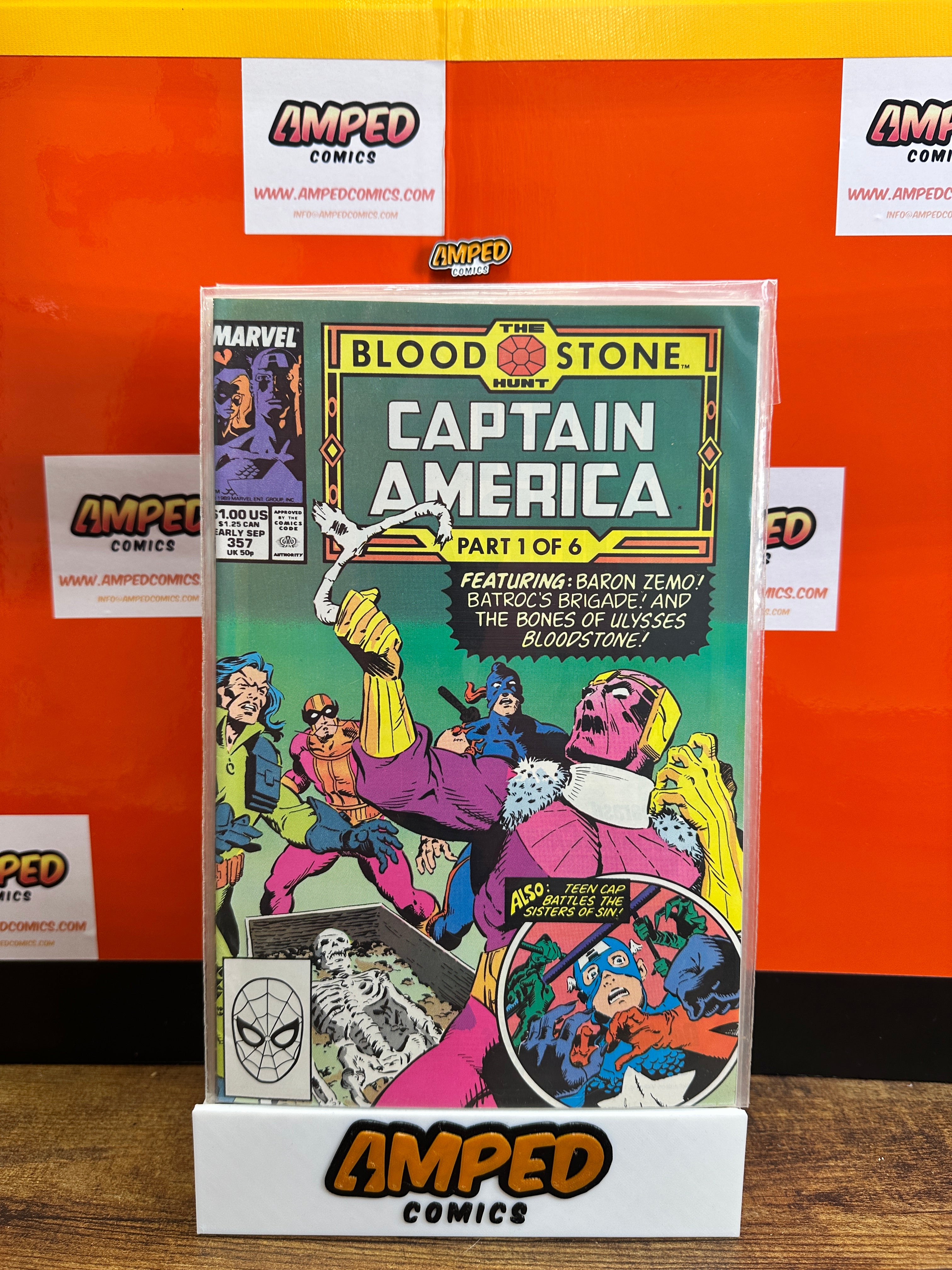Captain America #357, published by Marvel Comics in 1989. This issue is Part 1 of the 'Bloodstone Hunt' storyline and features appearances by Baron Zemo, Batroc's Brigade, and the Bones of Ulysses Bloodstone. The cover art highlights key characters and events from the story.
