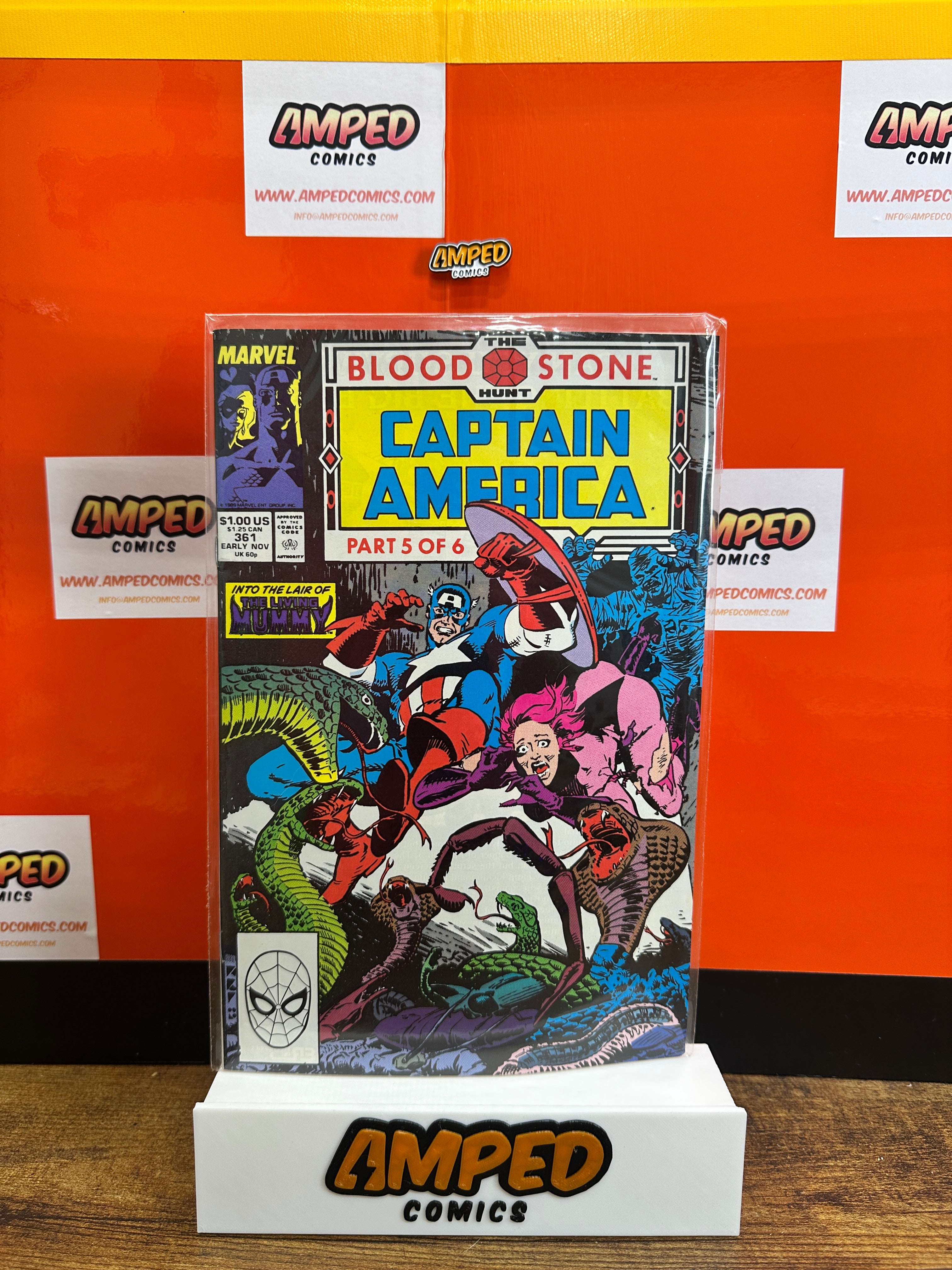 Captain America #362, published by Marvel Comics in November 1989. Part 5 of 6 in the Bloodstone Hunt storyline. Written by Mark Gruenwald with art by Kieron Dwyer. Features Captain America and Diamondback.