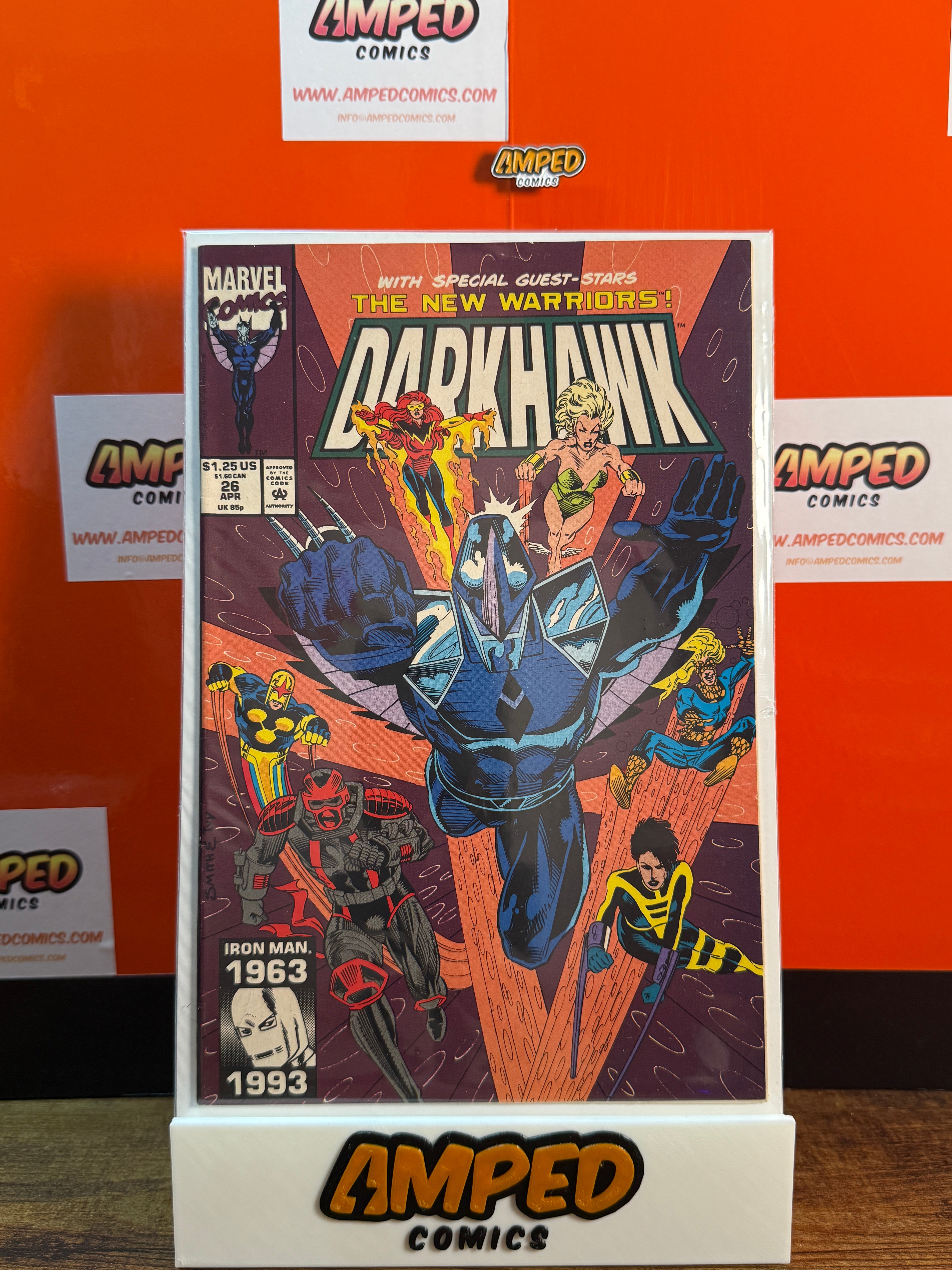 Darkhawk #26, published by Marvel Comics in April 1993. This issue features guest appearances by The New Warriors and includes characters such as Darkhawk, Iron Man, and others. The cover highlights vibrant artwork and a special storyline involving Iron Man's legacy from 1963 to 1993.