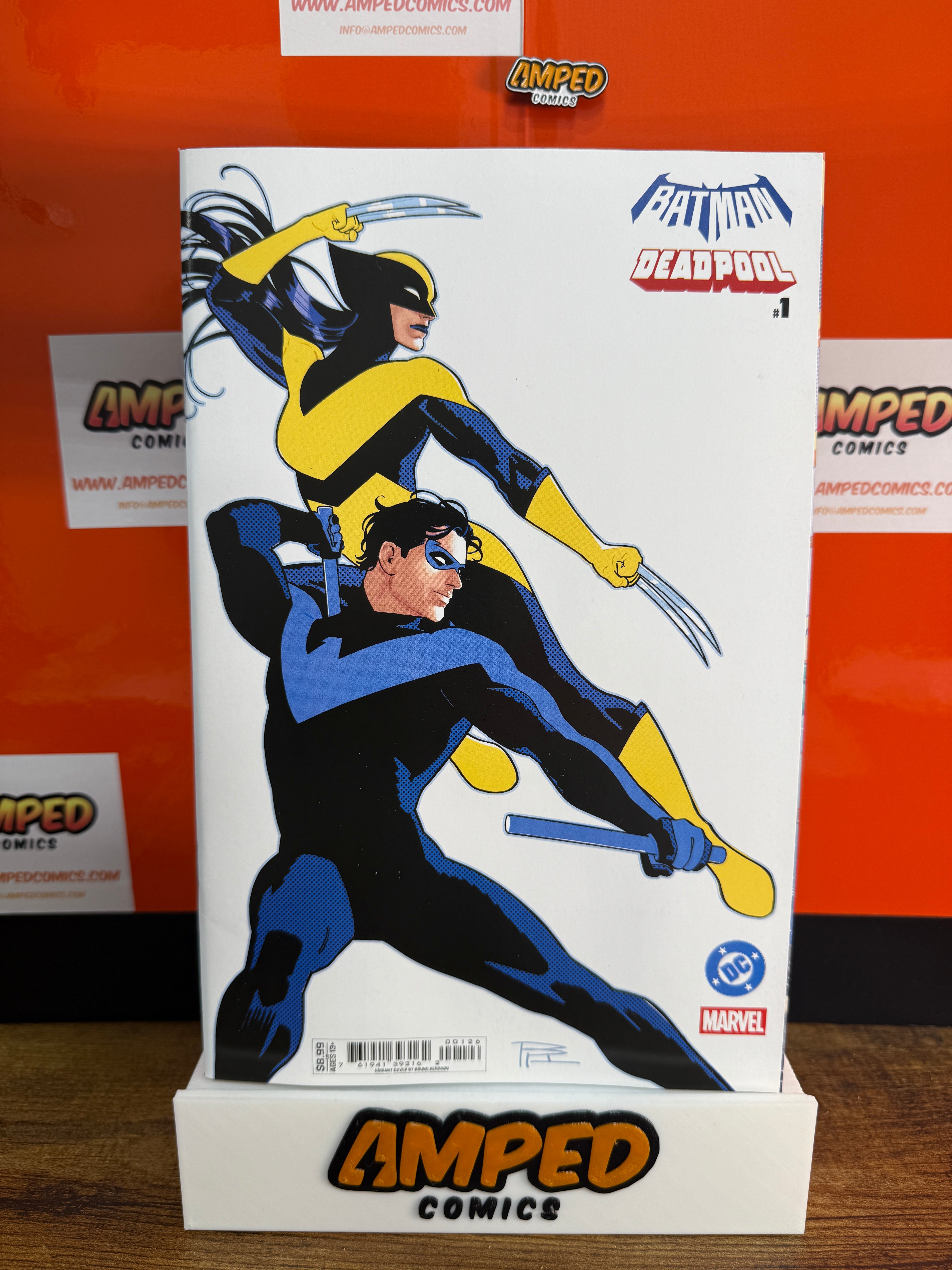 Batman/Deadpool #1 is a crossover comic featuring characters from DC Comics and Marvel Comics. The cover art showcases Batman and Deadpool in a dynamic pose. Published by Marvel and DC Comics, this issue marks a unique collaboration between the two publishers.