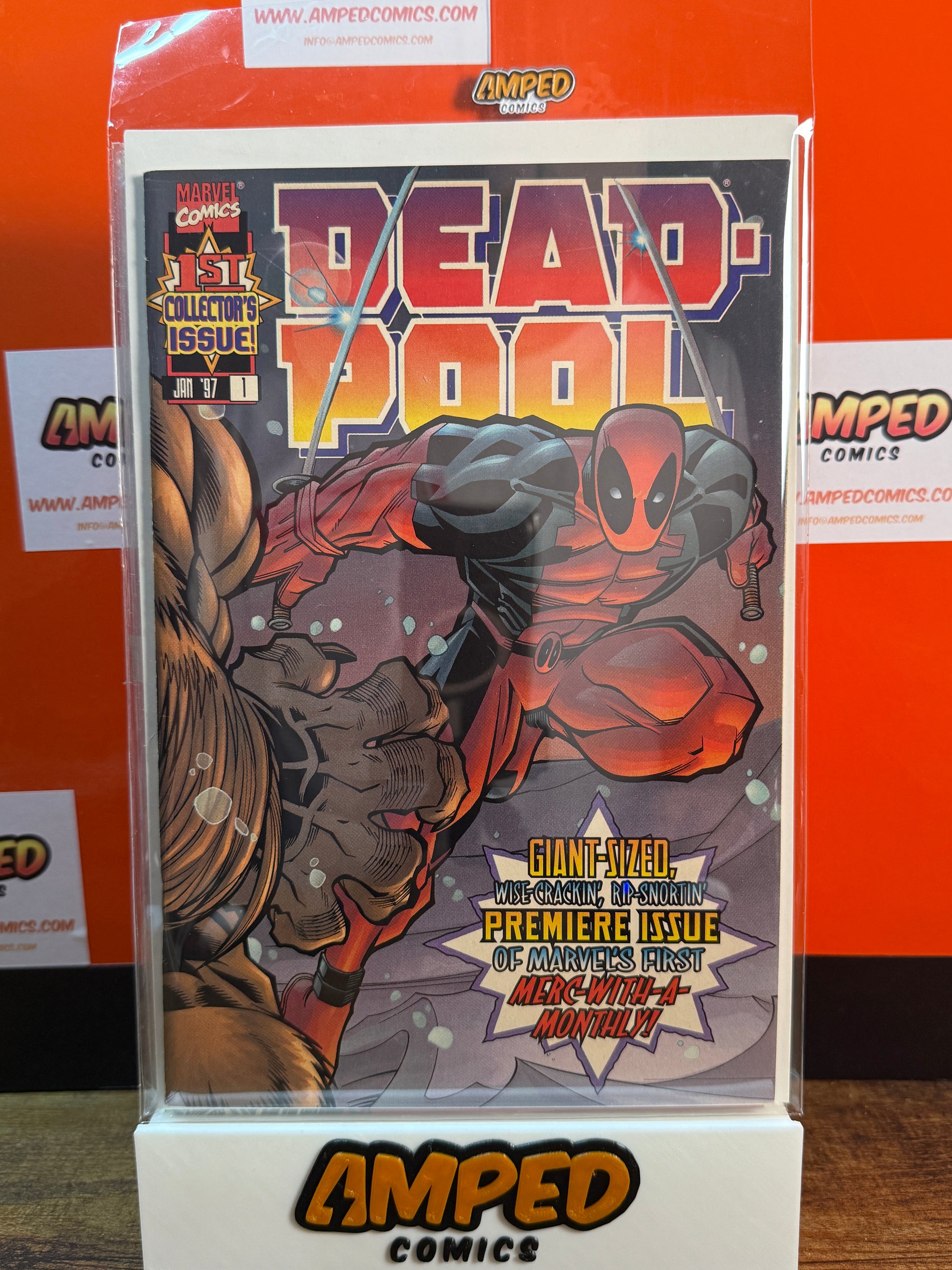 Deadpool #1, published by Marvel Comics in January 1997. This is the first collector's issue and the premiere issue of Marvel's first 'Merc-With-A-Monthly!' series. The cover features Deadpool in action, with vibrant artwork and dynamic design.