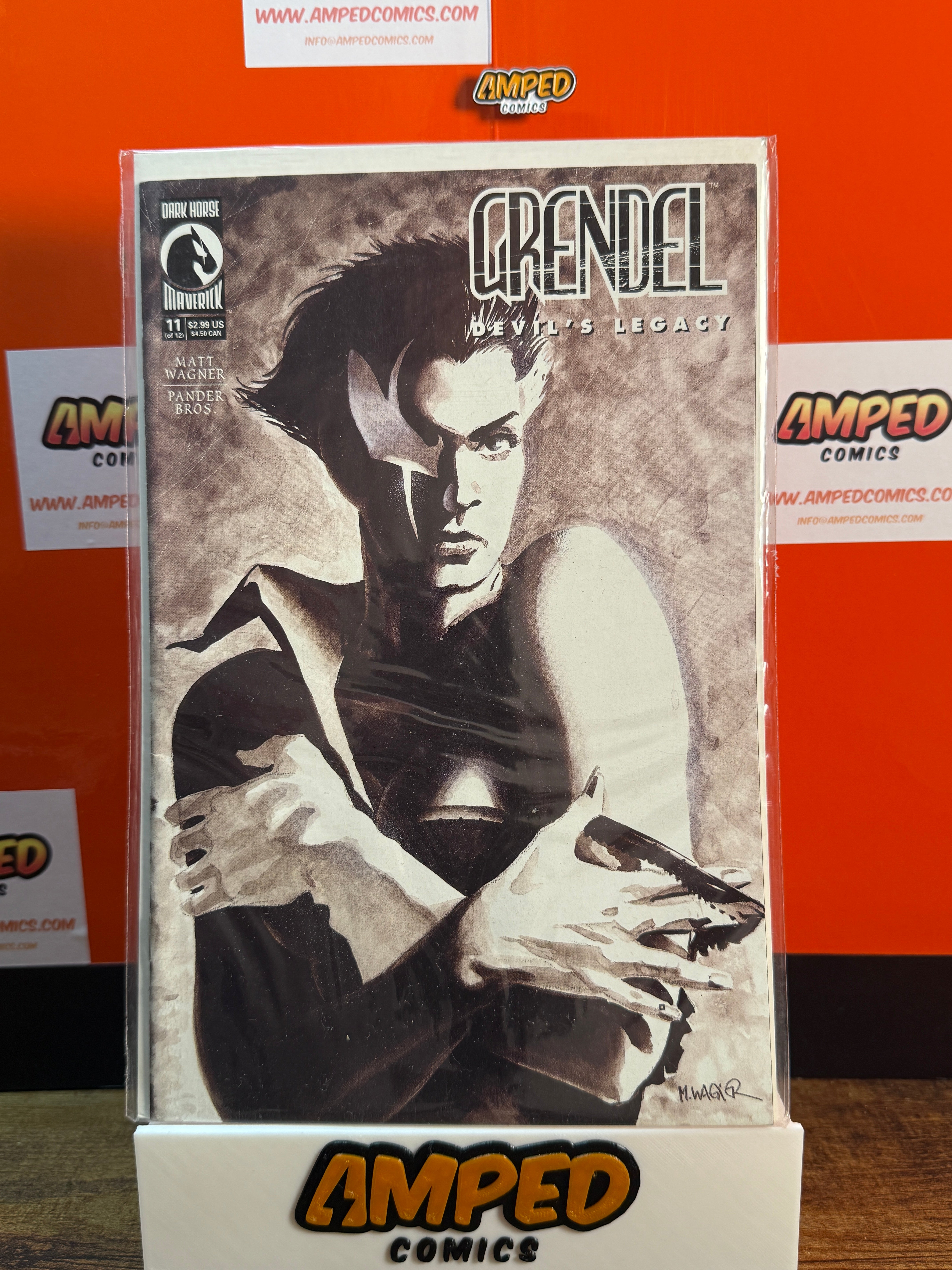 Grendel: Devil's Legacy #11, published by Dark Horse Comics in 1994. Written by Matt Wagner with artwork by the Pander Bros. This issue is part of the Grendel series and features striking cover art.