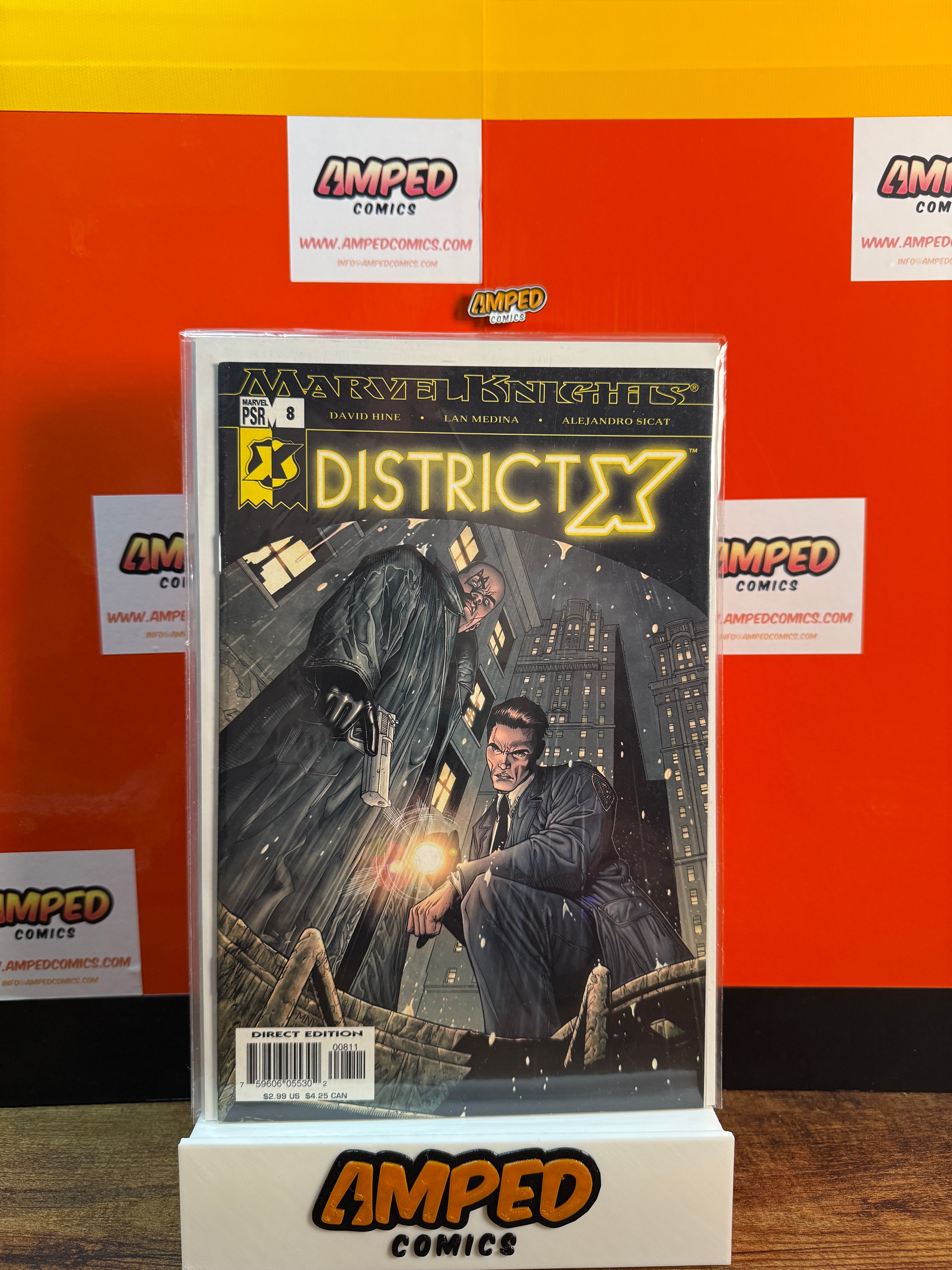 Marvel Knights District X #8, published by Marvel Comics in 2005. Written by David Hine with artwork by Lan Medina and Alejandro Sicat. The story features characters from the X-Men universe in a gritty, urban setting.