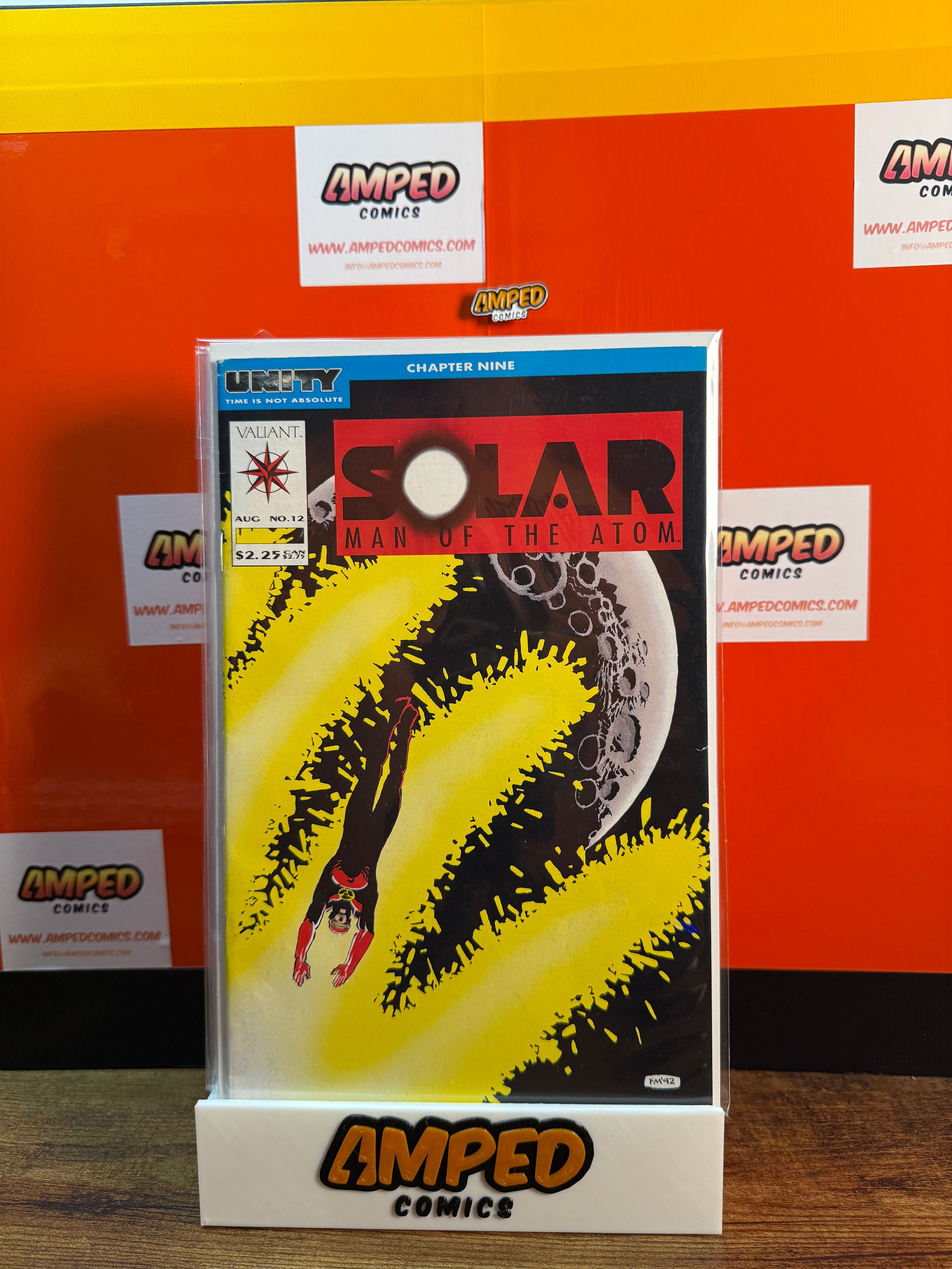 Solar: Man of the Atom #12, published by Valiant Comics in August 1992. Part of the Unity crossover event, Chapter Nine. Cover art features dynamic imagery with a cosmic theme.