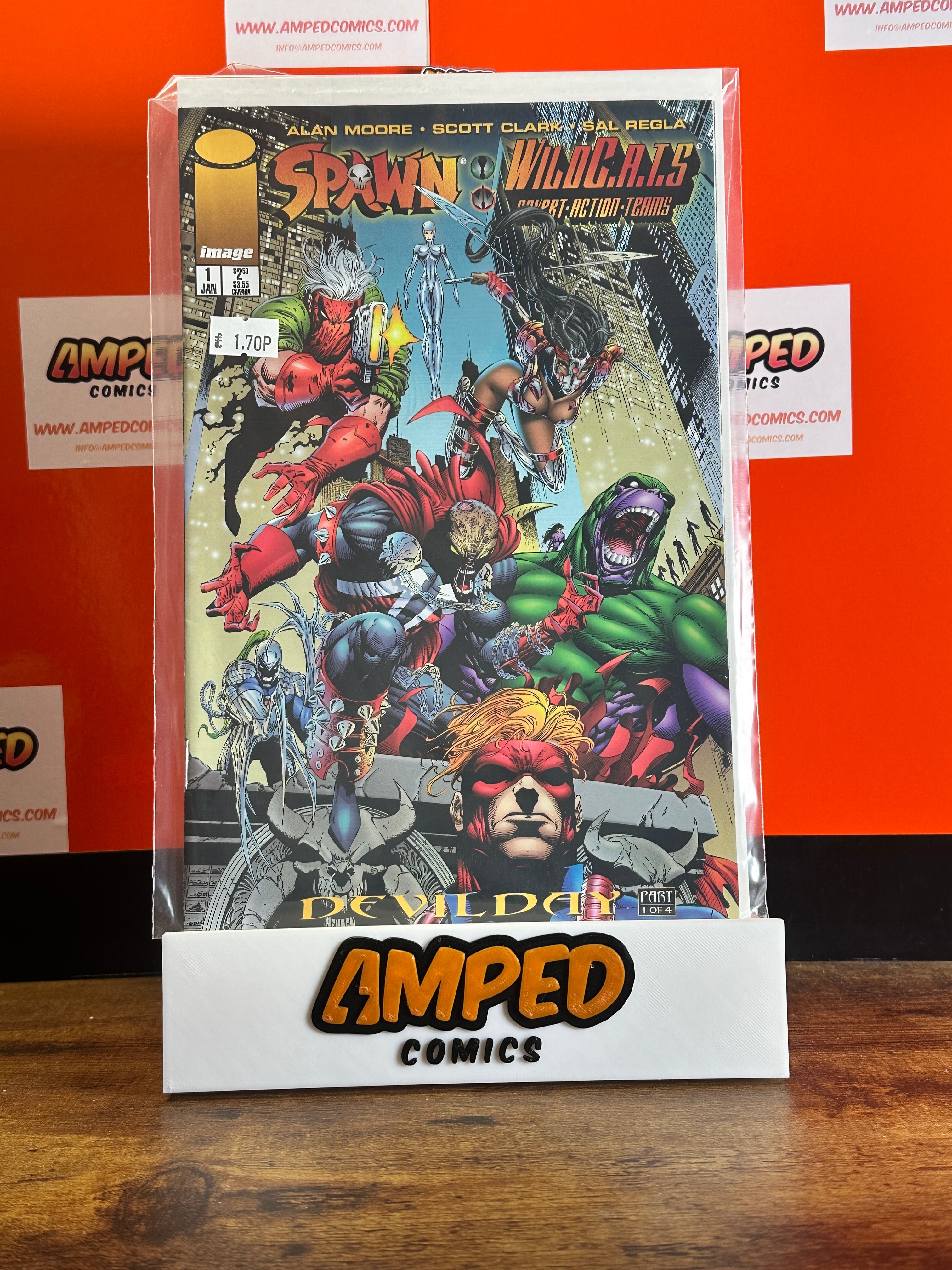 Spawn/WildC.A.T.s #1, published by Image Comics in January 1996. Written by Alan Moore with artwork by Scott Clark and Sal Regla. Features a crossover between Spawn and WildC.A.T.s characters. Part 1 of a 4-part series.