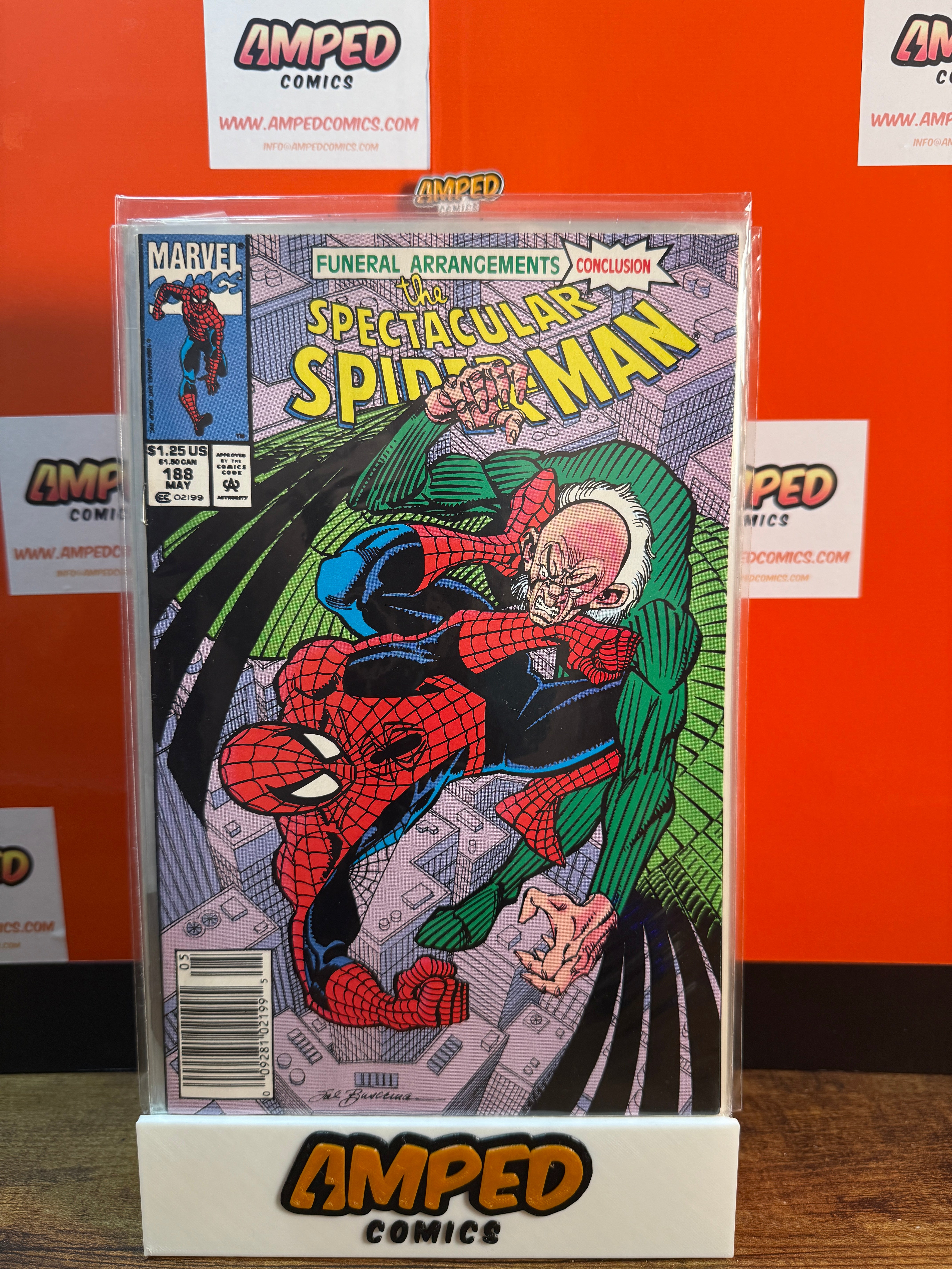 The Spectacular Spider-Man #188, published by Marvel Comics in May 1992. This issue is part of the 'Funeral Arrangements' storyline and features Spider-Man. Cover art by Sal Buscema.
