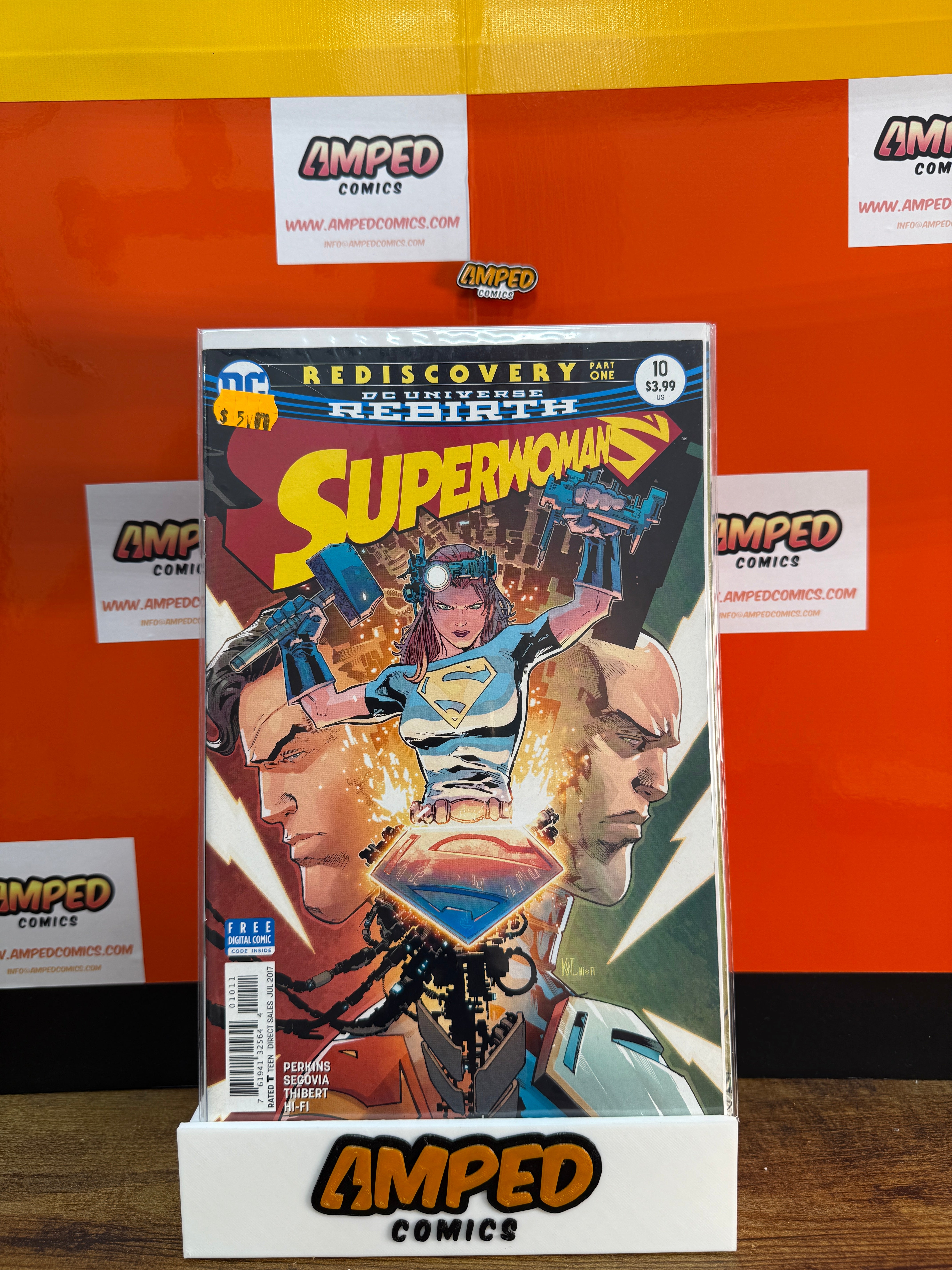 Superwoman #10, published by DC Comics in 2017 as part of the DC Universe Rebirth series. Written by Perkins with artwork by Segovia and Thibert. Features characters such as Superwoman, Superman, and Lex Luthor. This issue is titled 'Rediscovery Part One.'