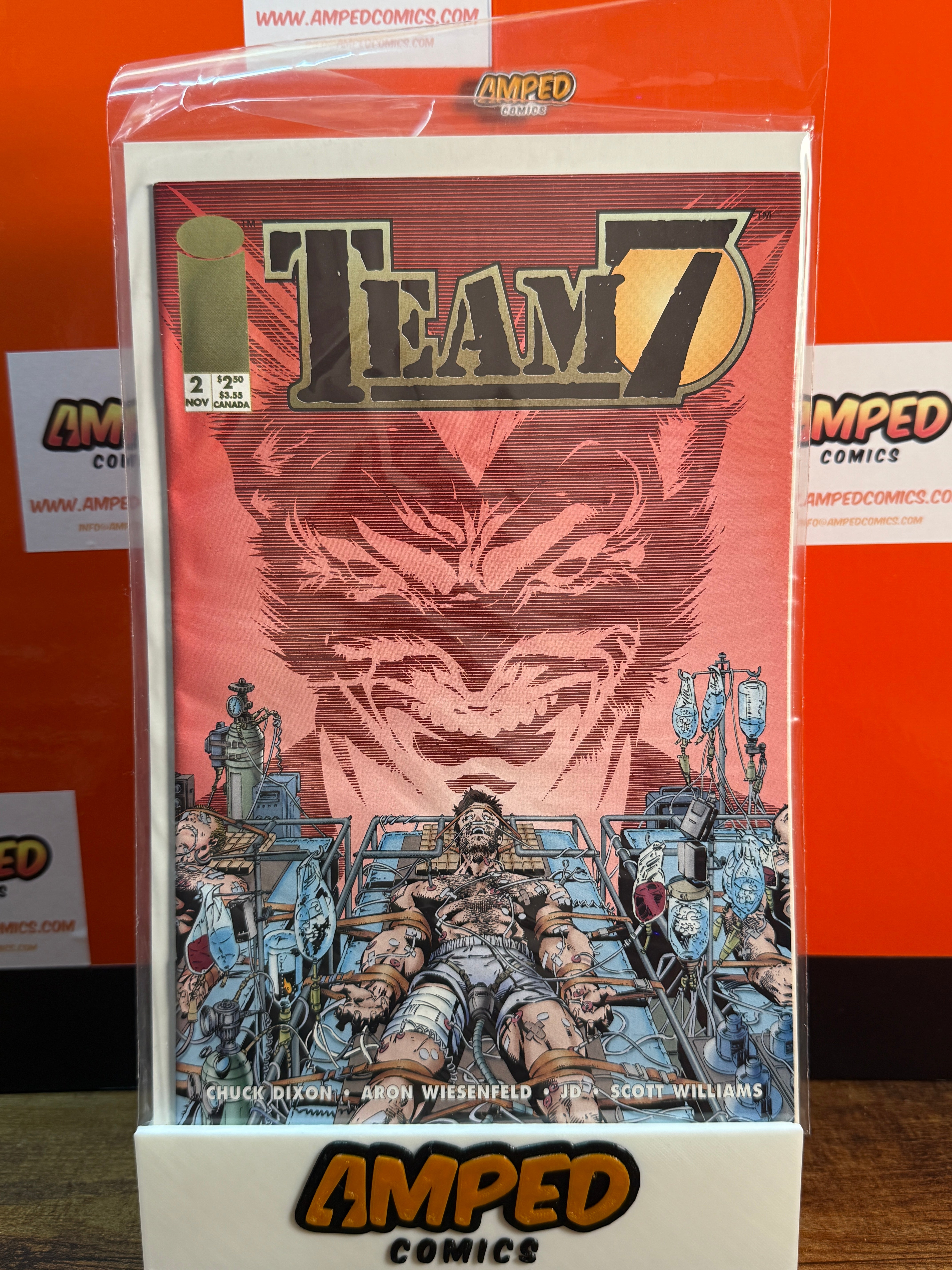 Team 7 #2, published by Image Comics in November 1994. Written by Chuck Dixon with artwork by Aron Wiesenfeld, J.D., and Scott Williams. The cover features a striking design with a central character restrained in a laboratory setting.