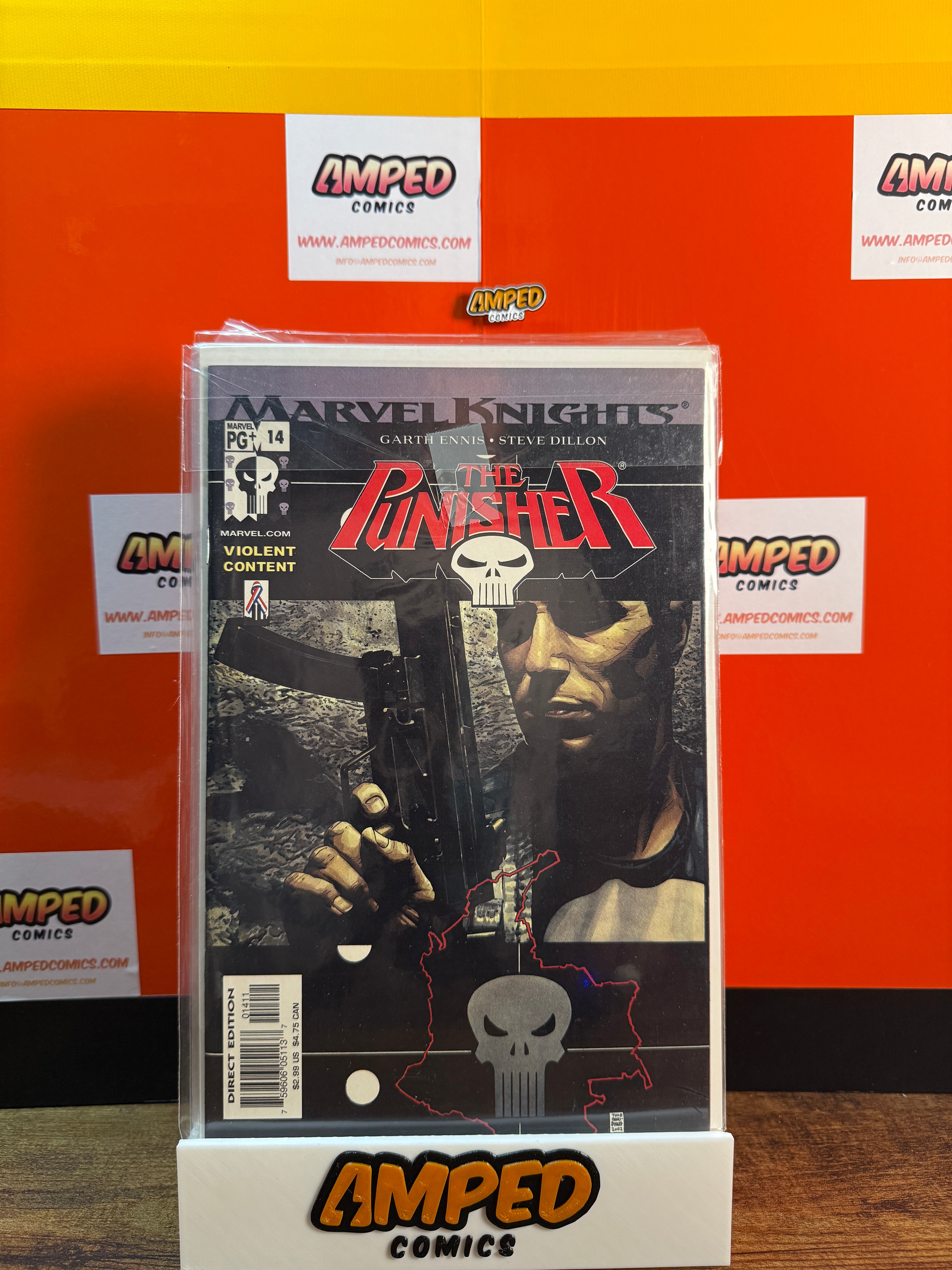 The Punisher #14 from Marvel Knights, published by Marvel Comics in 2002. Written by Garth Ennis with artwork by Steve Dillon. Features Frank Castle (The Punisher) in a storyline with violent content. Direct Edition.