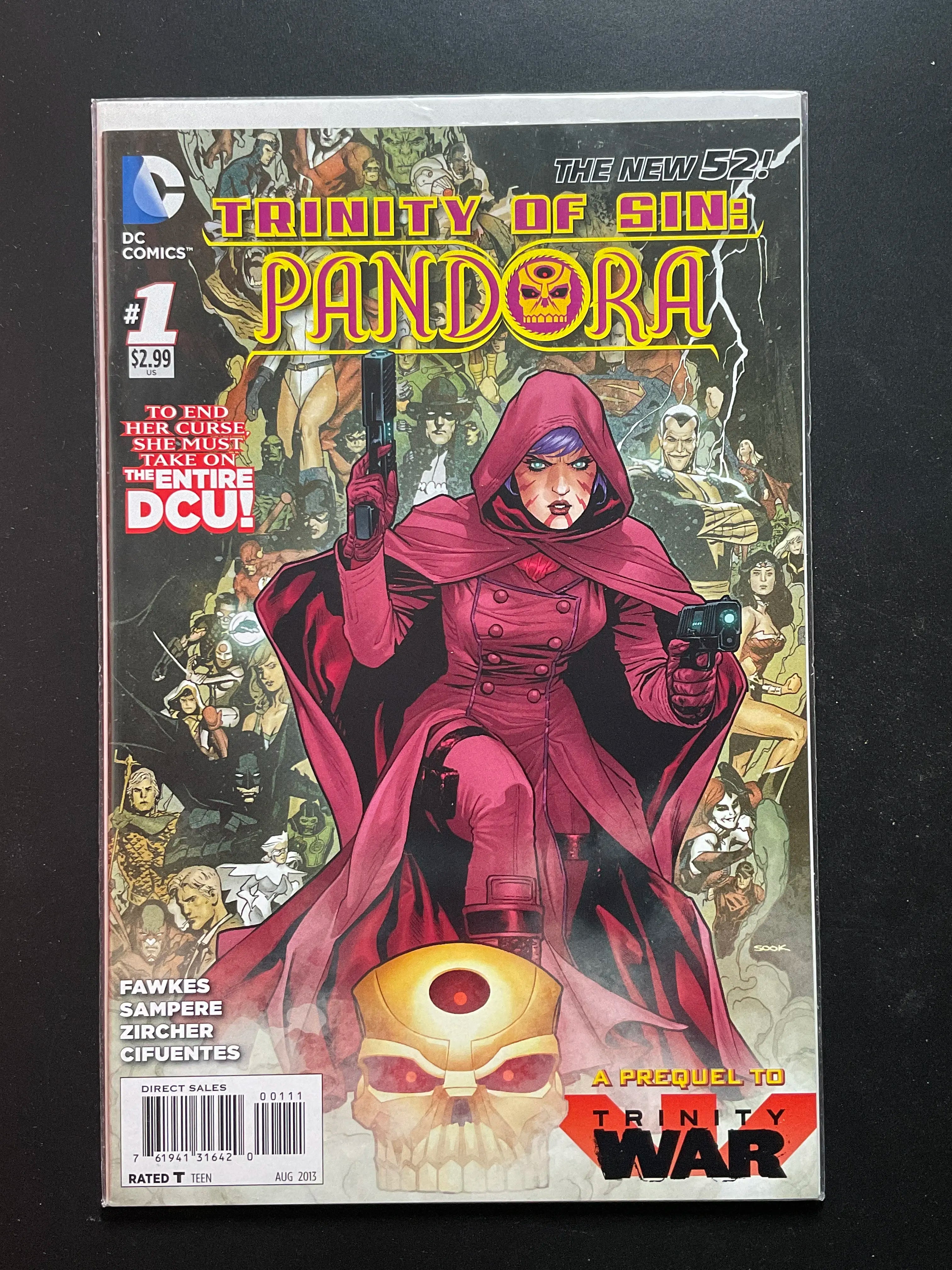 Trinity of Sin: Pandora #1, published by DC Comics in August 2013. Written by Ray Fawkes with art by Daniel Sampere, Vicente Cifuentes, and ZIRCHER. This issue serves as a prequel to the 'Trinity War' storyline and features Pandora as the main character.