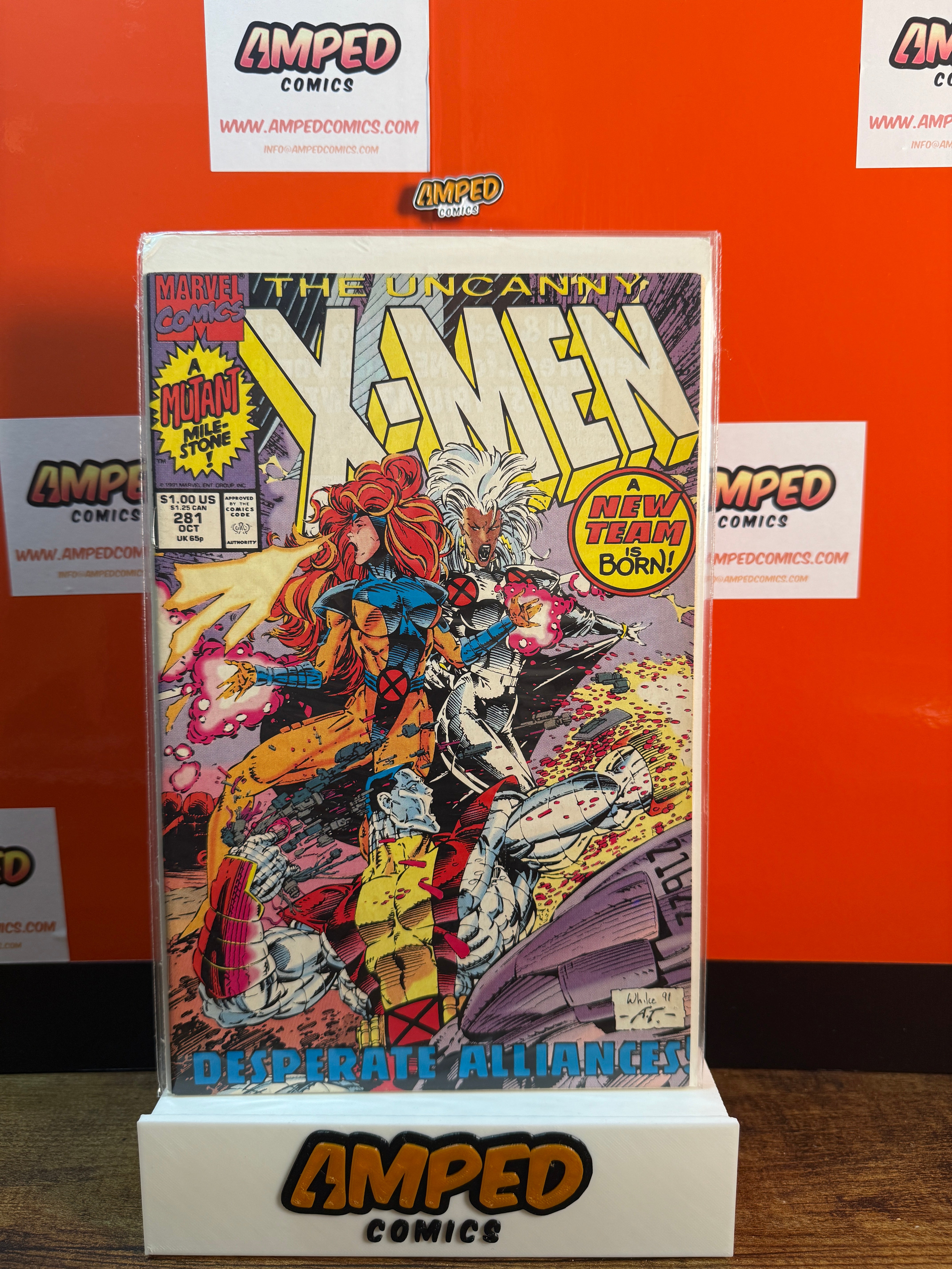 The Uncanny X-Men #281, published by Marvel Comics in October 1991. Written by Jim Lee and Whilce Portacio, this issue introduces a new team of X-Men. The cover features characters such as Storm, Colossus, and Jean Grey. The storyline is titled 'Desperate Alliances.'