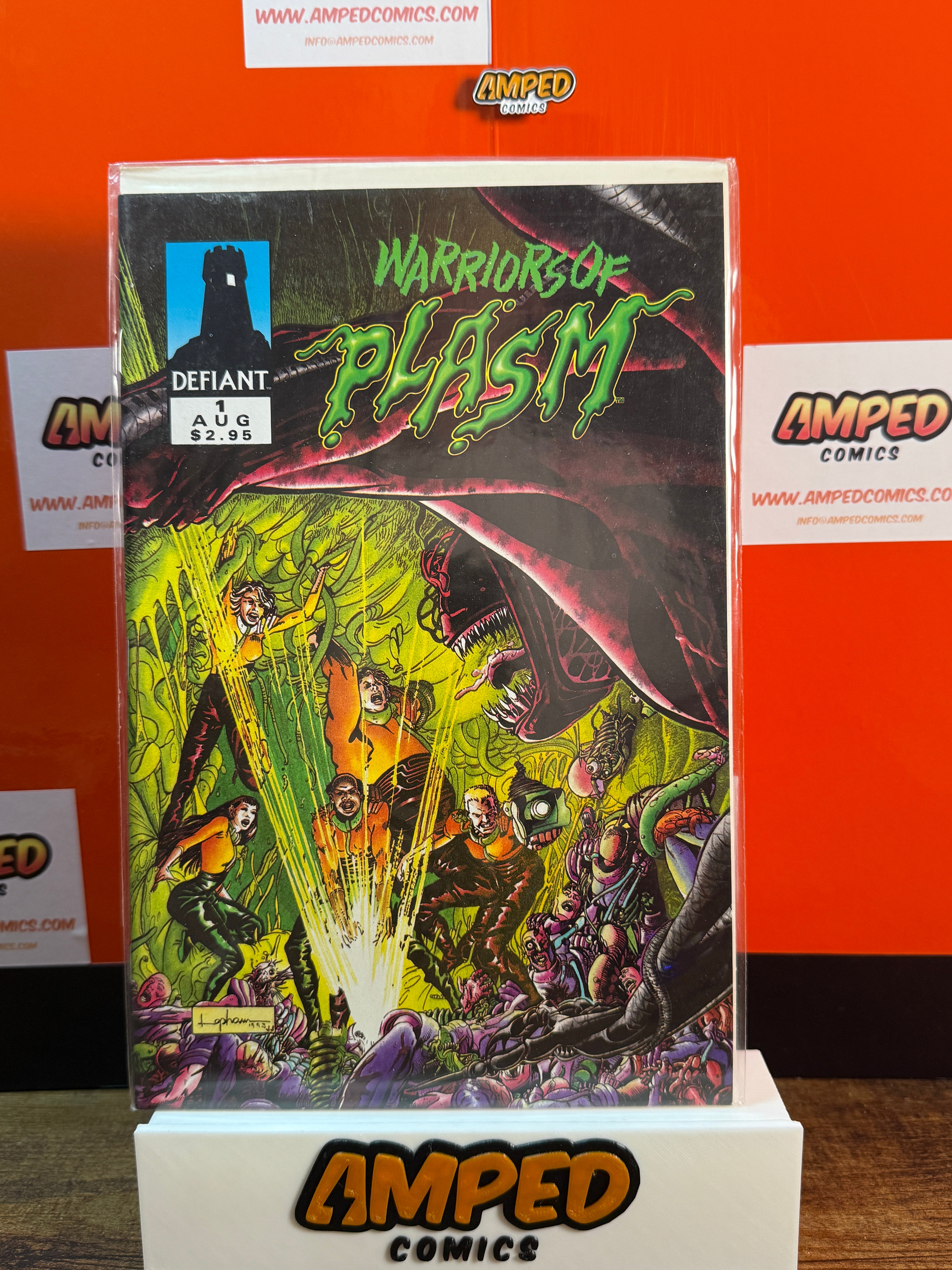 Warriors of Plasm #1, published by Defiant Comics in August 1993. Created by Jim Shooter, this issue introduces the series and features a vibrant cover with science fiction themes. The story revolves around a group of characters navigating a bio-engineered alien world.