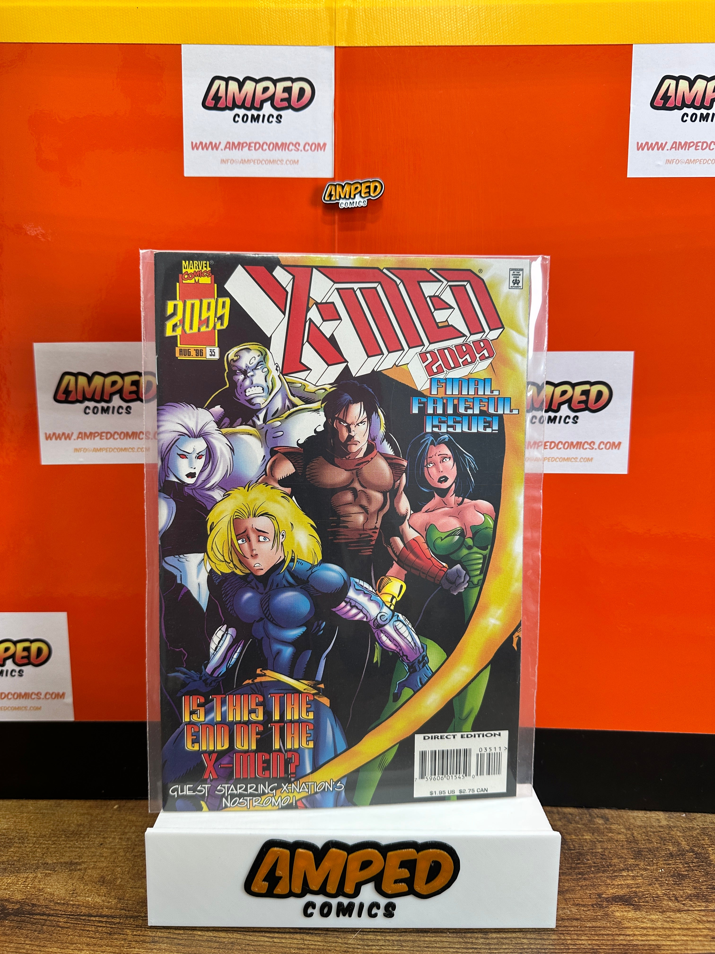 X-Men 2099 #35, published by Marvel Comics in August 1996. This issue is the final installment of the X-Men 2099 series and features appearances by X-Nation's Nostromo. The cover art highlights key characters from the series.